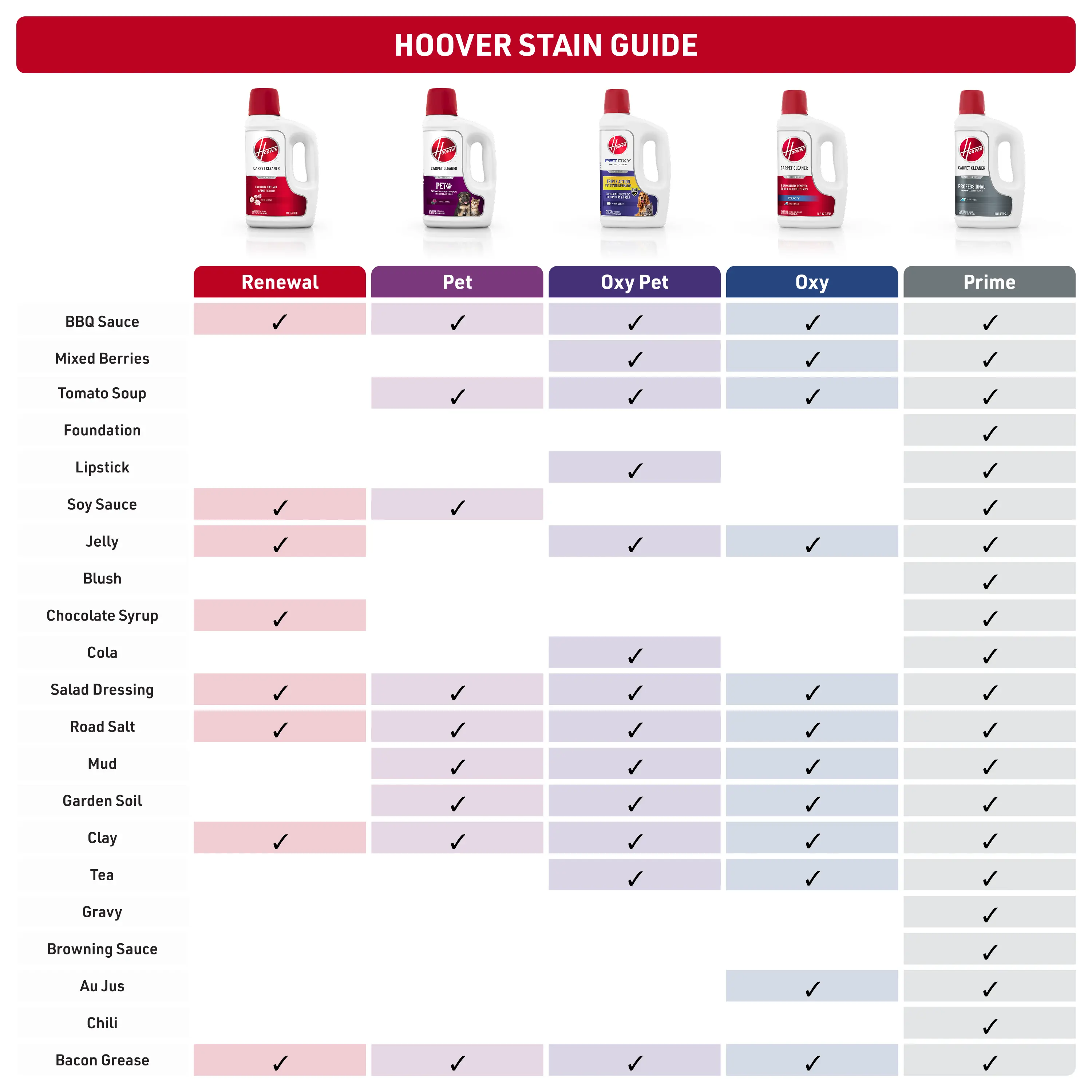 Win against life's toughest stains with HOOVER® Oxy Carpet Cleaning Formula. This fast-acting, stain fighting formula attacks and breaks down both old and new stains for easy cleaning. Oxy technology neutralizes pungent odors and leaves your carpets smelling fresh and clean with an ocean breeze scent.