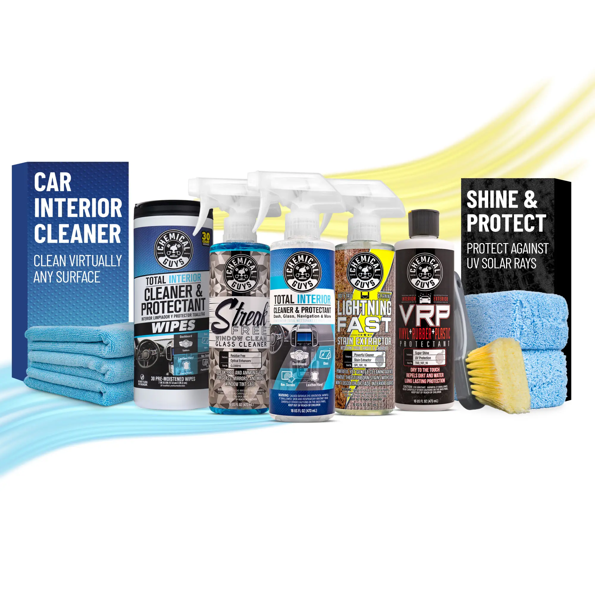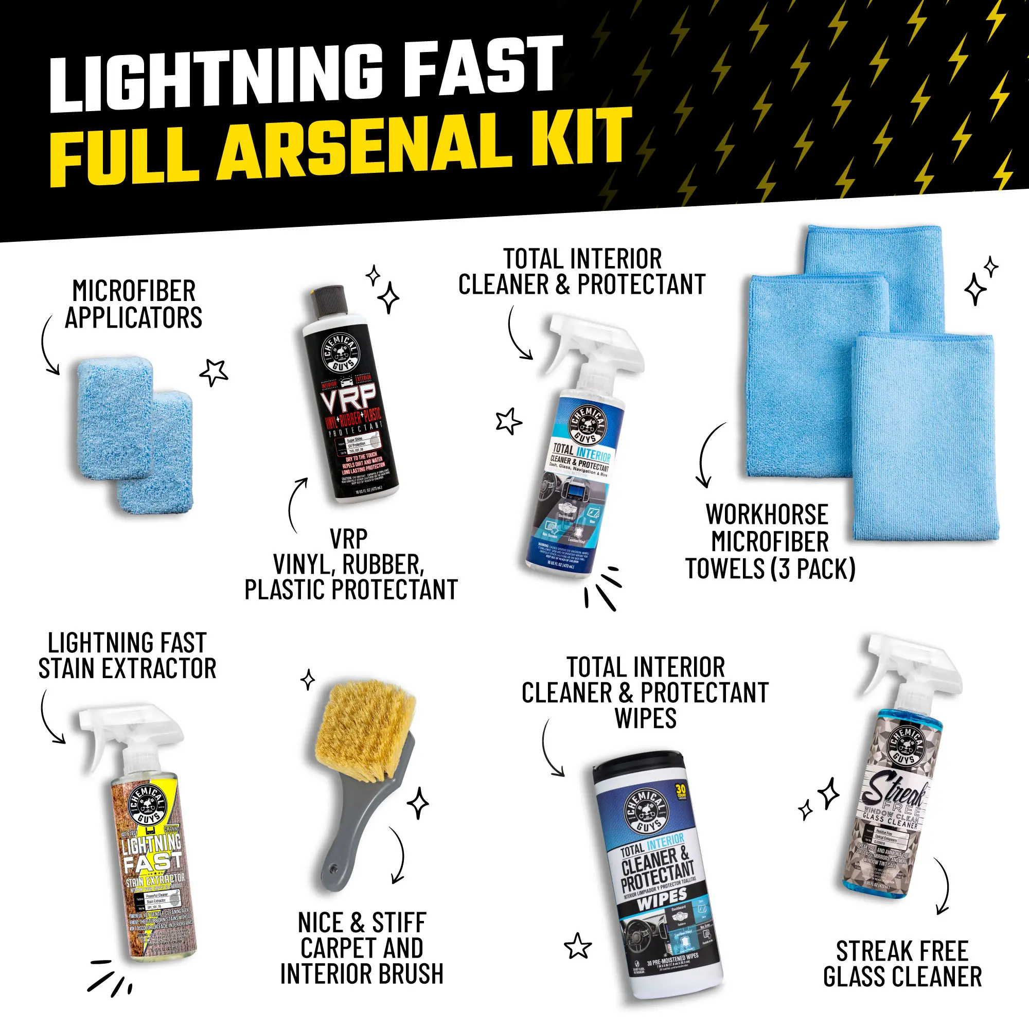 ·Bundle 4 includes: Lightning Fast + Total Interior + Total Interior Wipes + VRP + Streak Free + 3-pack Workhorse Microfiber Towels + 2-pack Microfiber Applicators + Nice + Stiff Brush