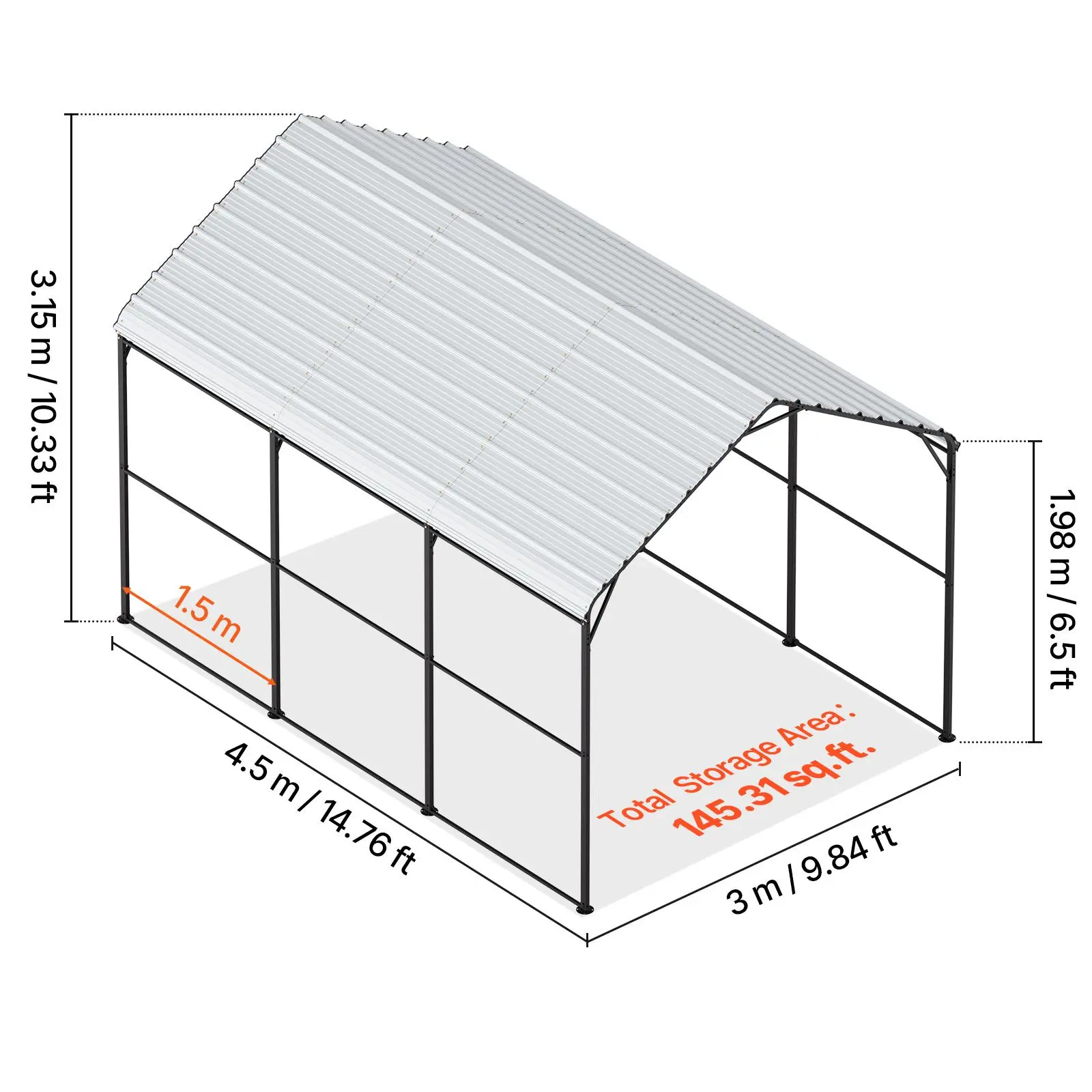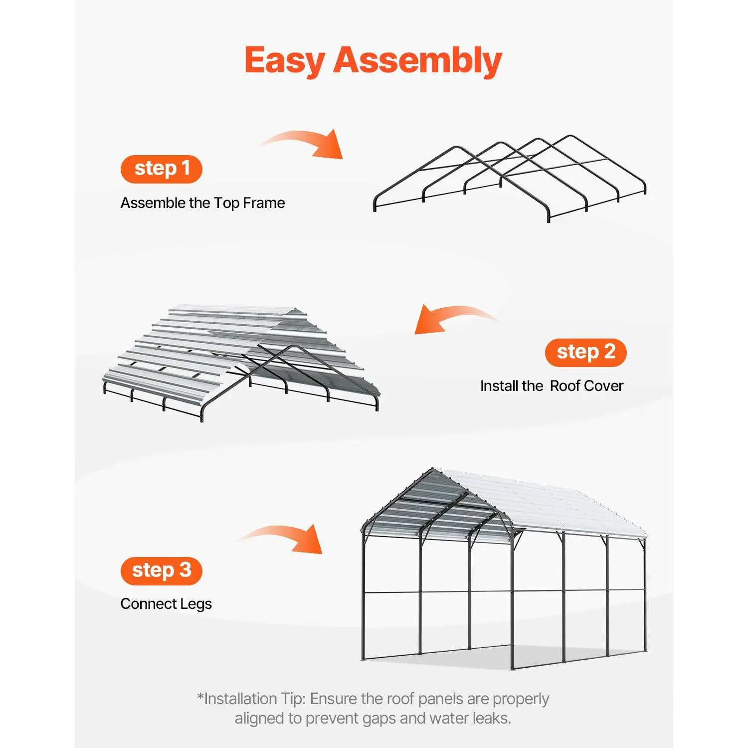 • Sturdy Roof: The roof is made of galvanized steel, providing long-lasting protection. It’s equipped with upgraded high-density sealing tape to prevent leaks from rain, making it excellent for withstanding harsh weather. With a roof load capacity of 35lb/ft², this carport with steel roof is ideal for protecting your vehicles and equipment from the elements.