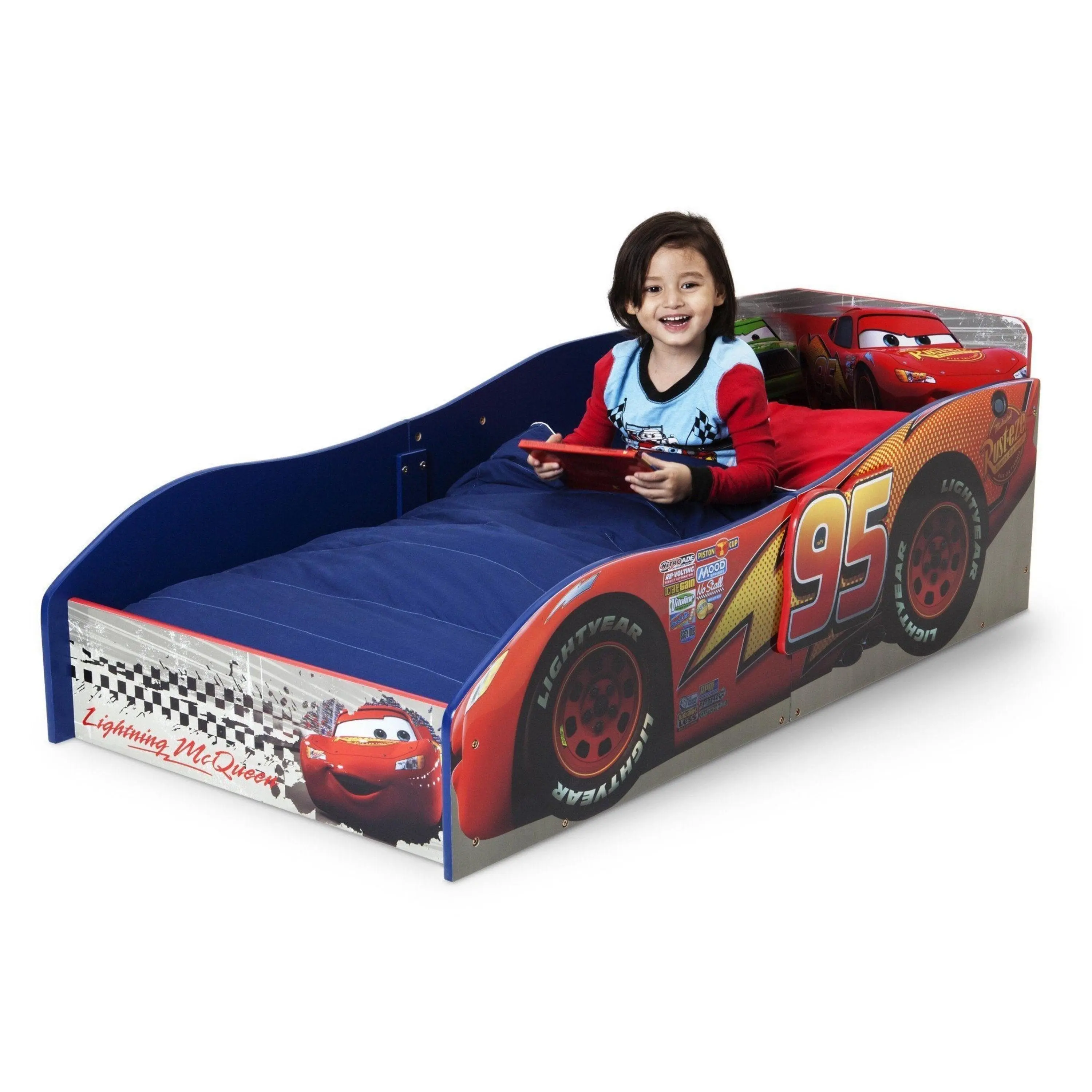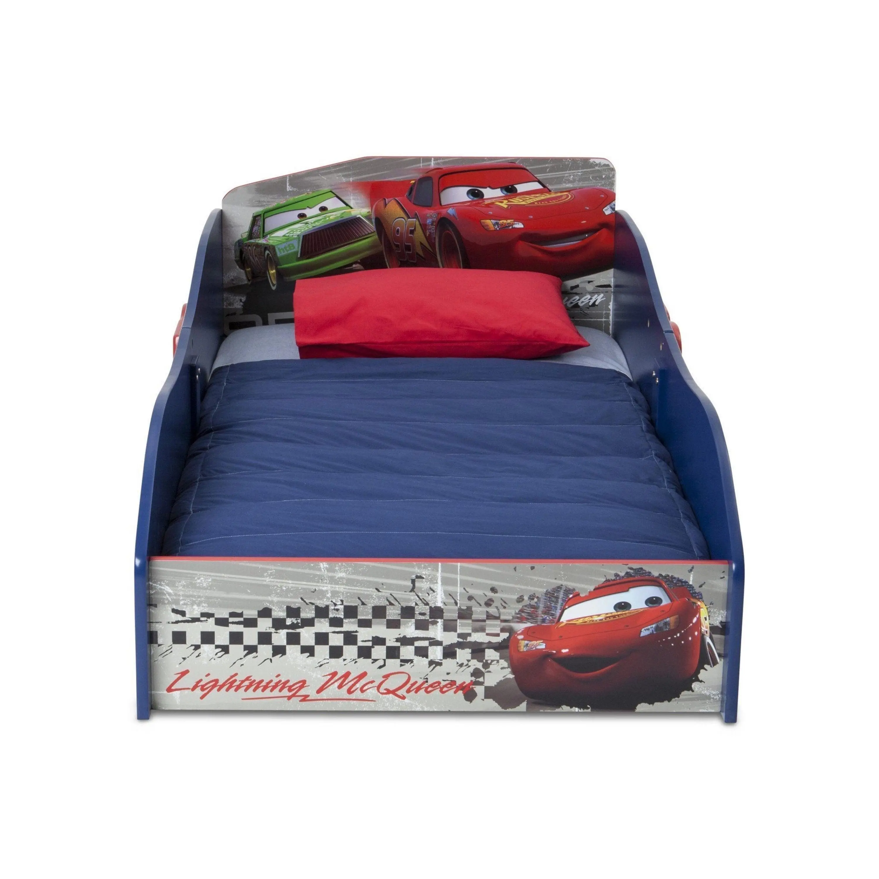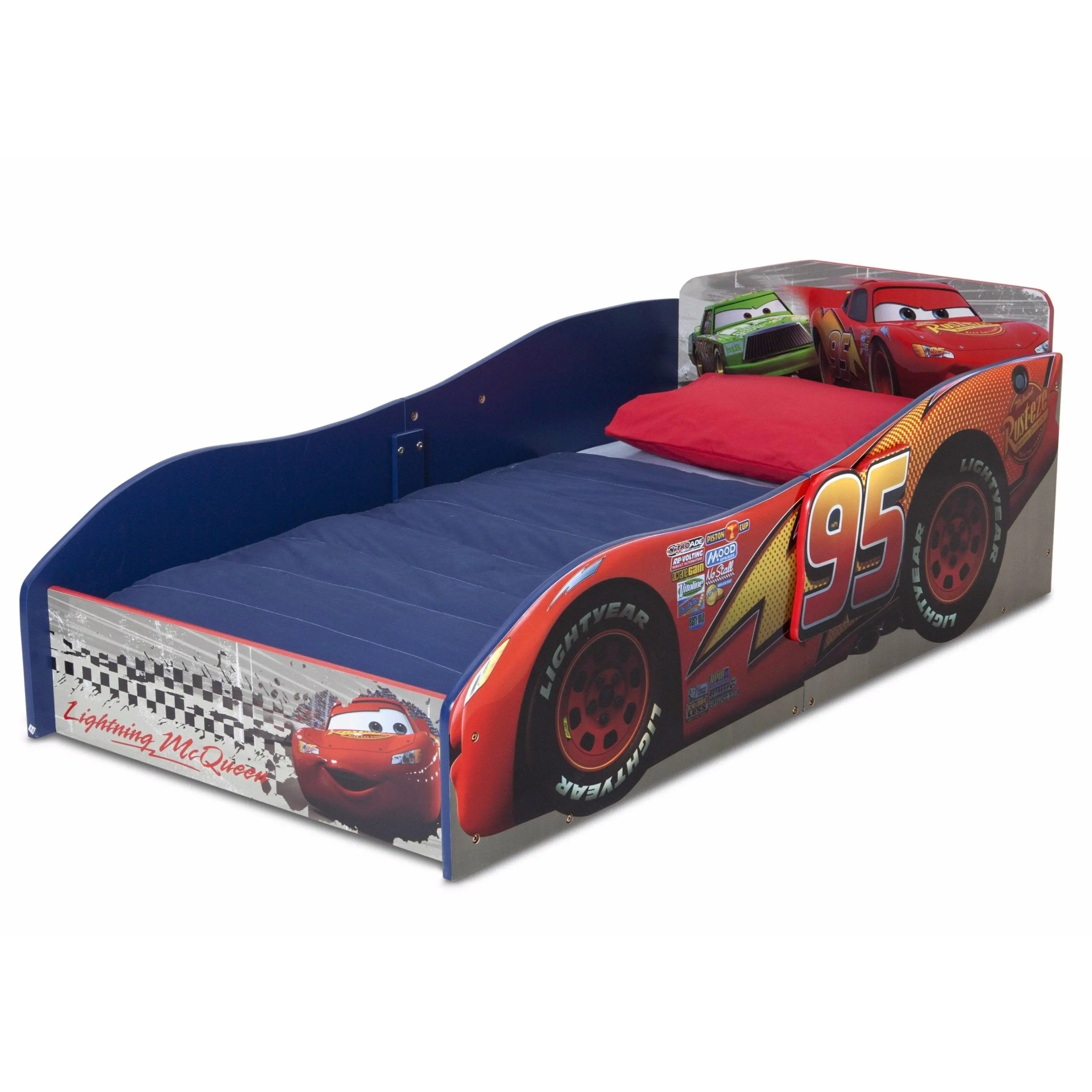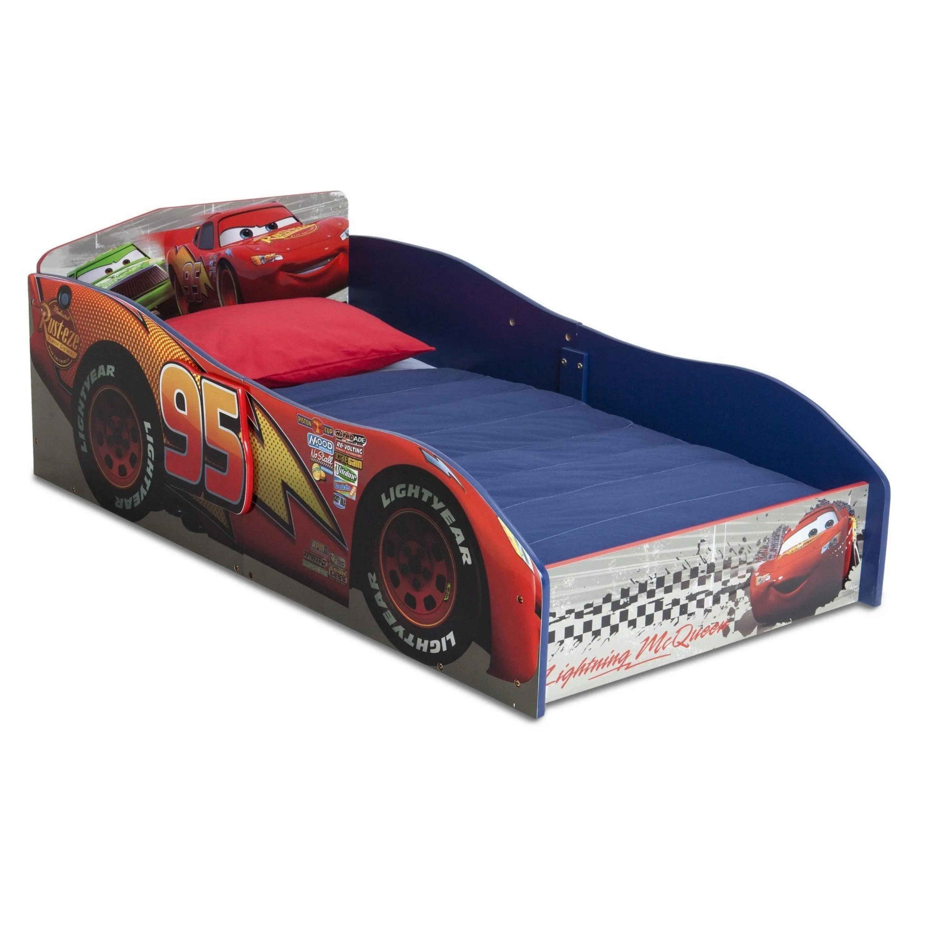 Petal to the Metal with Lightning McQueen in this newly designed Cars Wood Toddler Bed. The toddler bed is designed to be just like Lightning McQueen's own speedy race car embracing a friendly and fun way to transition your child from a crib to Toddler Bed. The Disney Pixar Cars Wood Toddler Bed also features a durable wood construction to ensure both safe sleeping and comfortability. Meets all JPMA safety standards. Some assembly required.