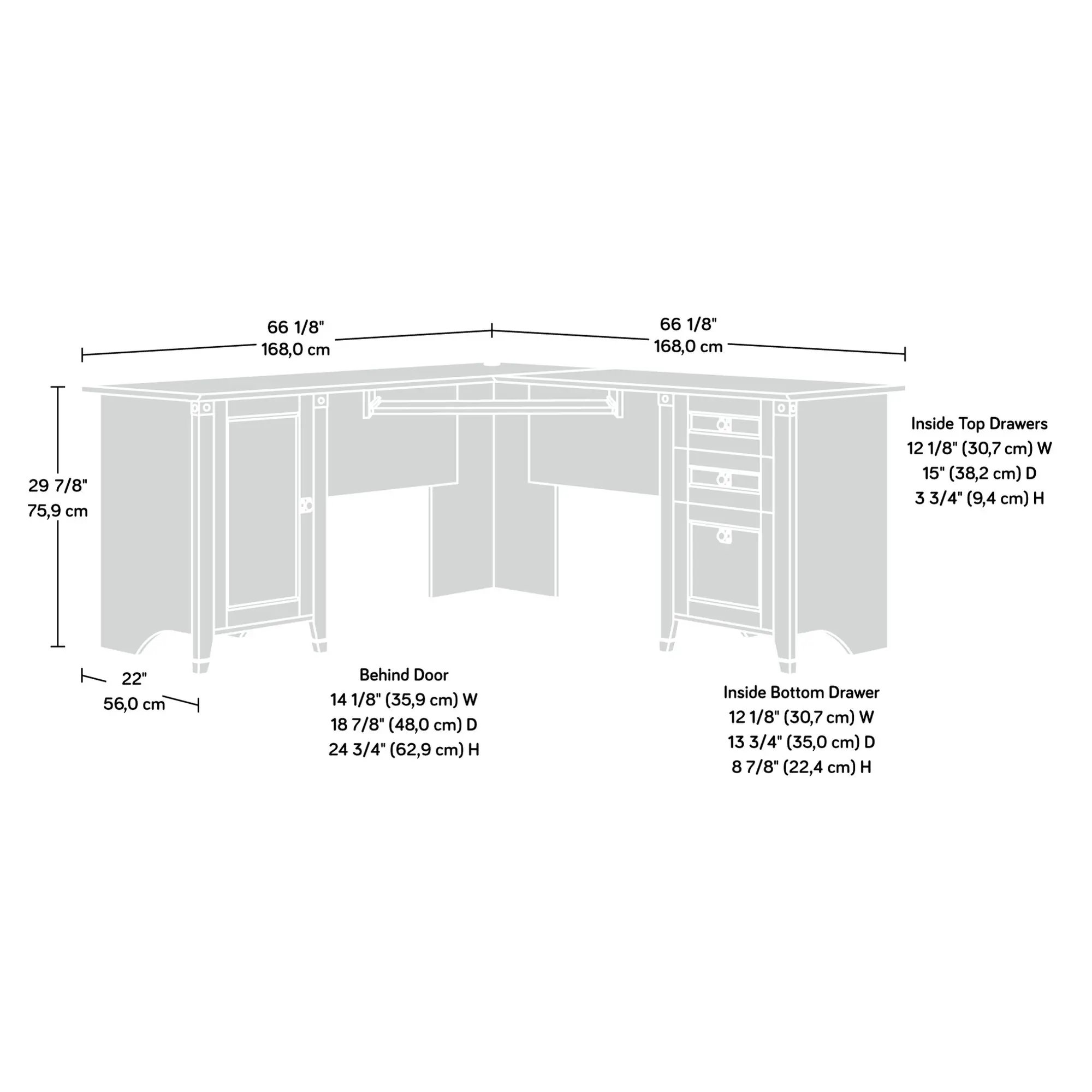 This versatile corner desk maximizes your workspace. It features a spacious tabletop for laptops, documents, and decorative items. The slide-out keyboard/mouse shelf with metal runners and safety stops ensures easy access. Three smooth-gliding drawers keep office supplies organized. The lower drawer holds hanging files.