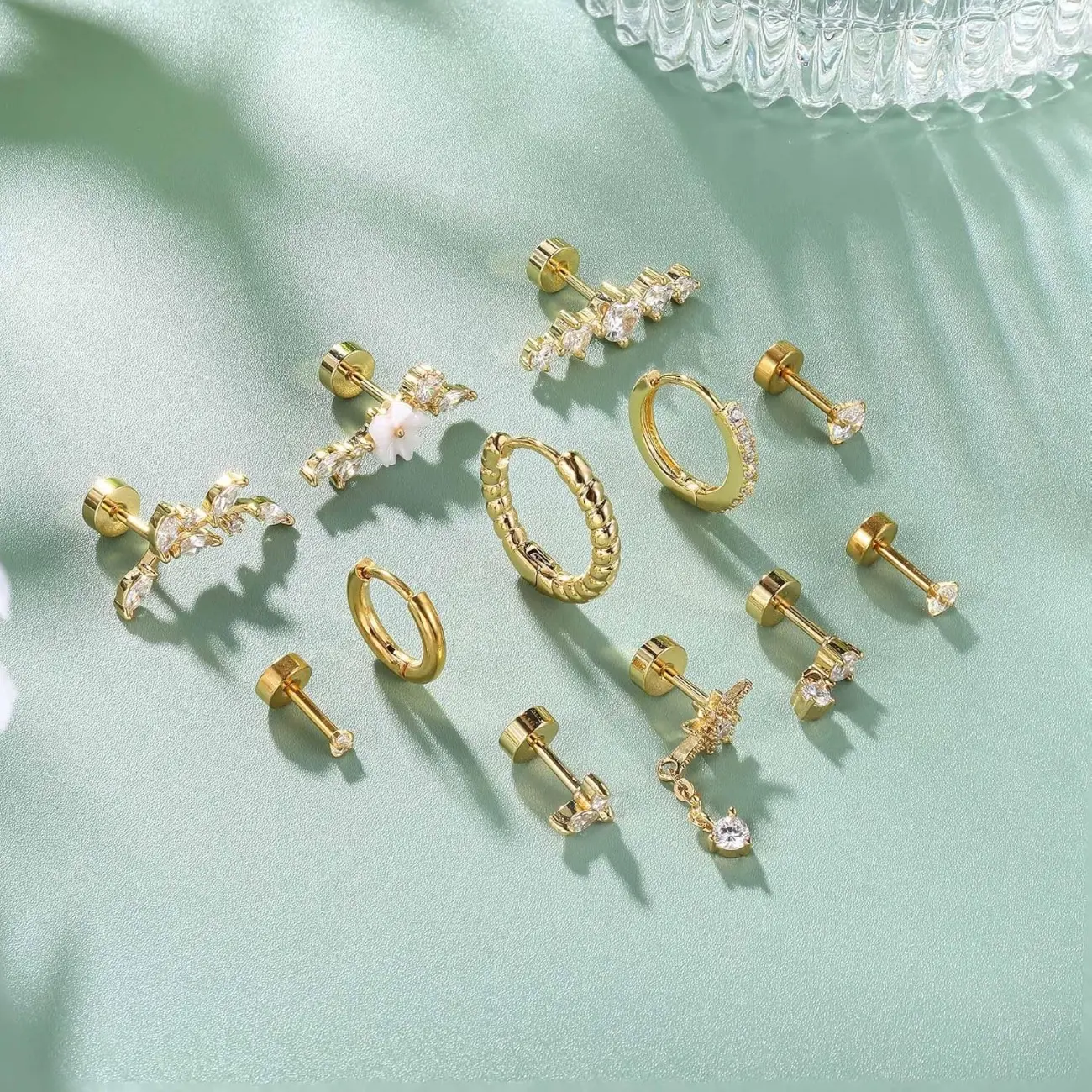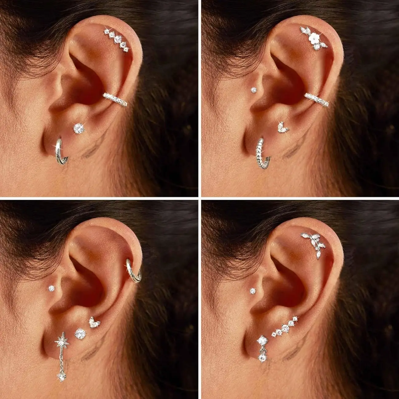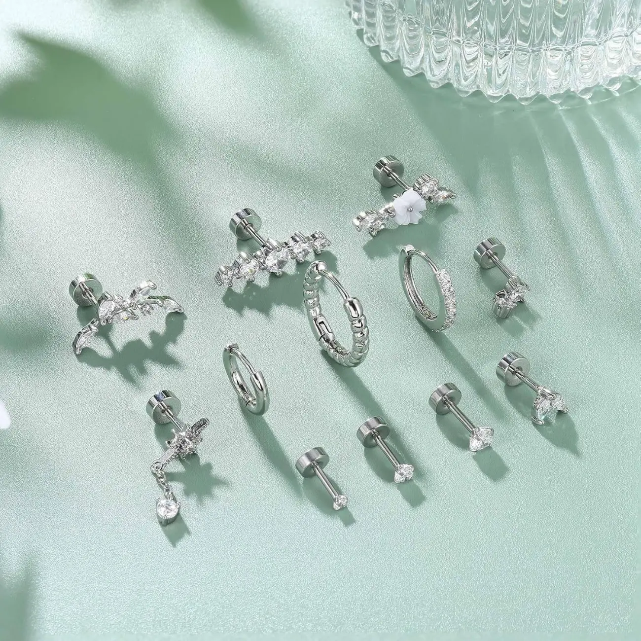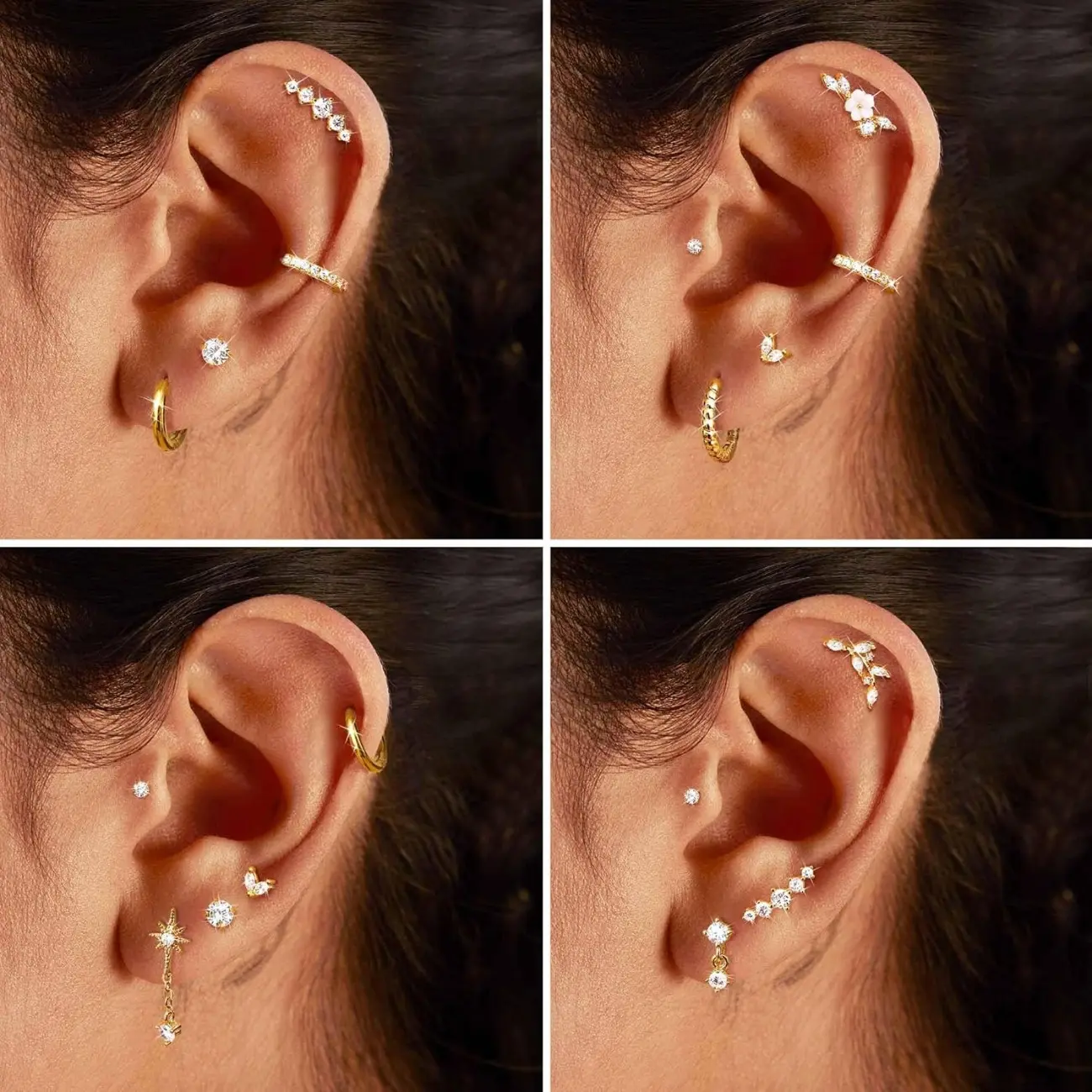 ·Cartilage Earring Sets for Multiple Piercing---12PCS Single 16G cartilage earrings for women,including 3PCS ear climber earrings,3PCS CZ flat back stud earrings tragus,2PCS dangle helix earrings,3PCS conch hoop piercing jewelry.The piercing earrings set look great worn alone or mixed or matched with other earrings,just enjoy DIY fun with your piercing jewelry