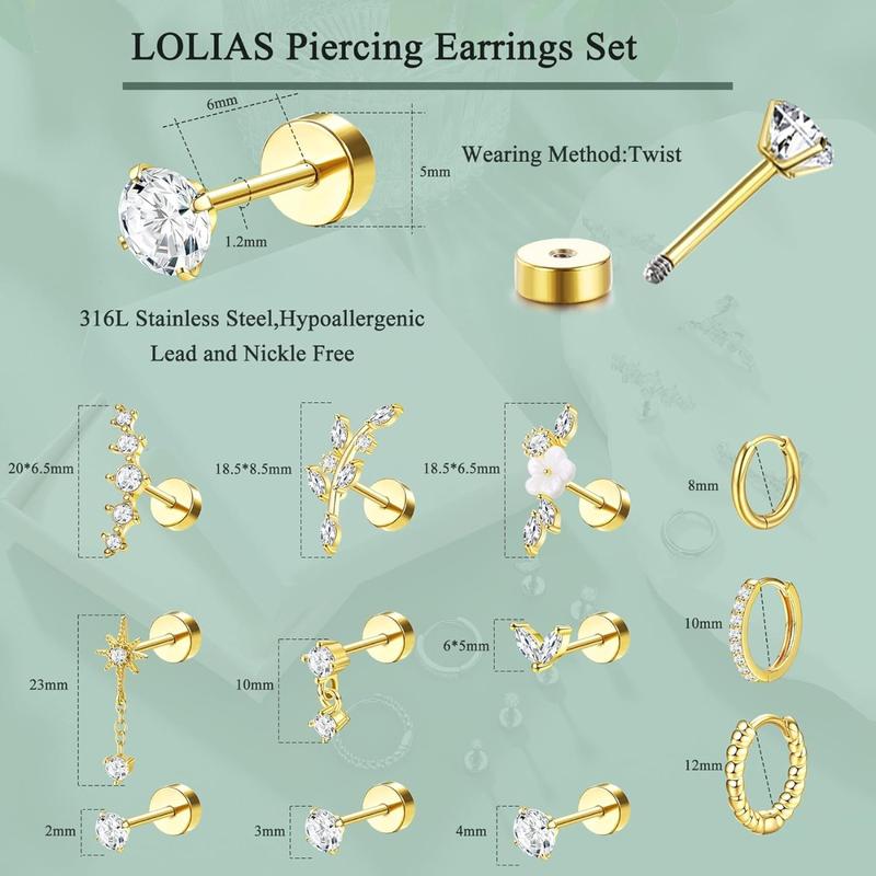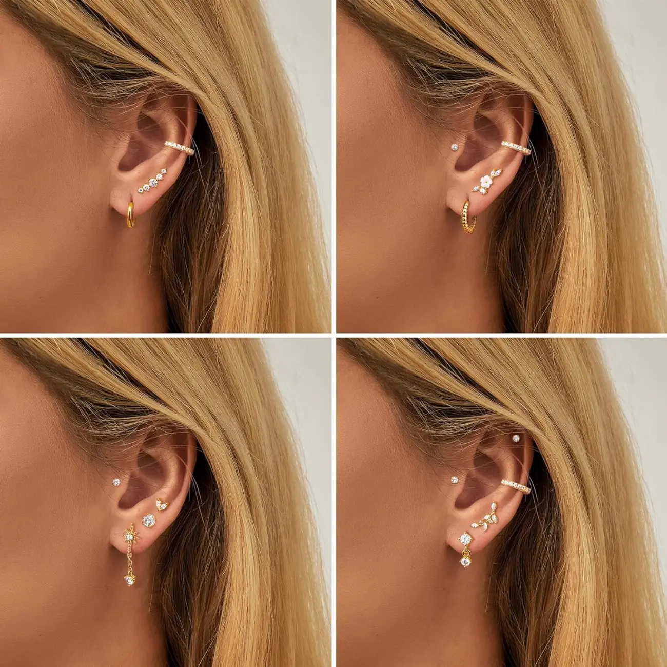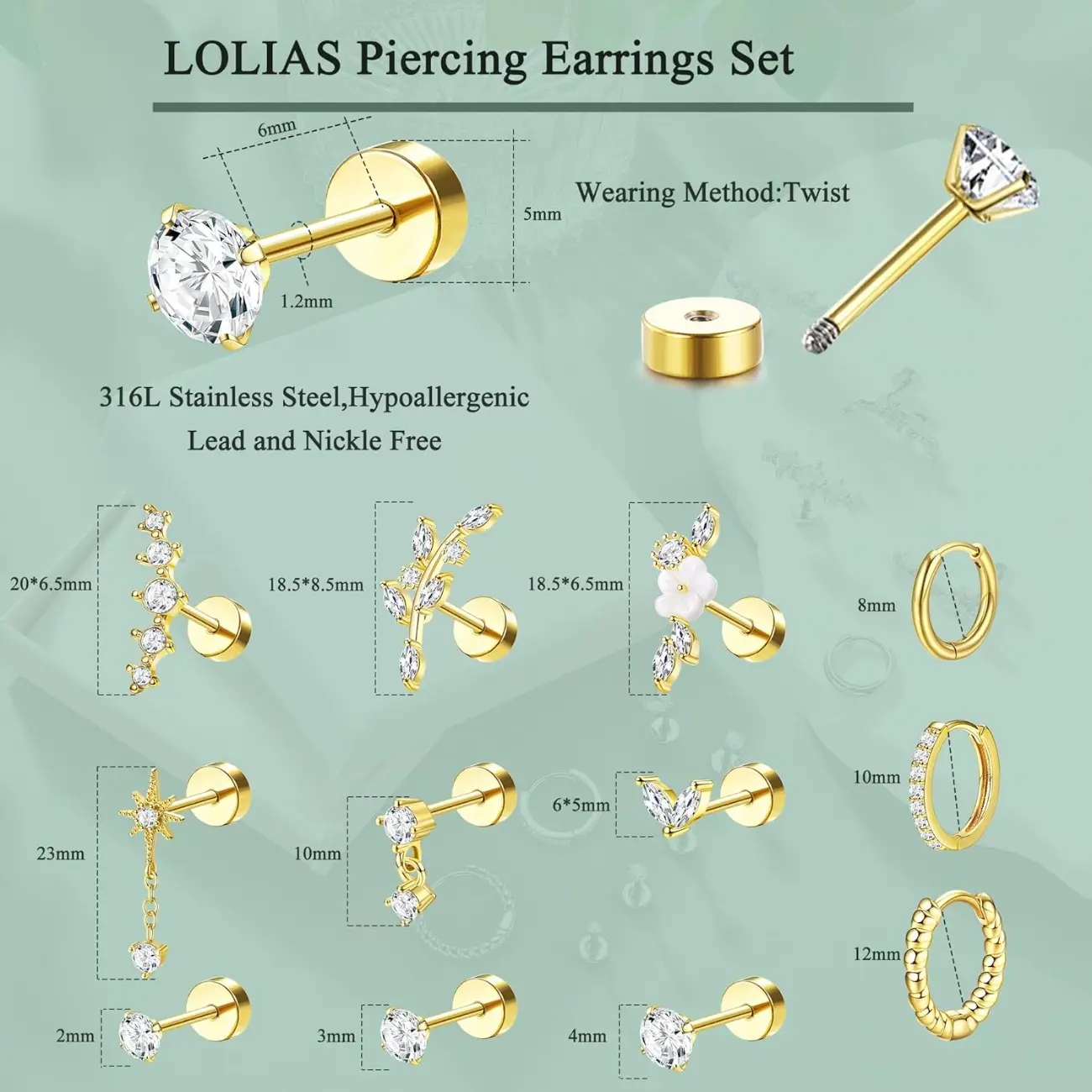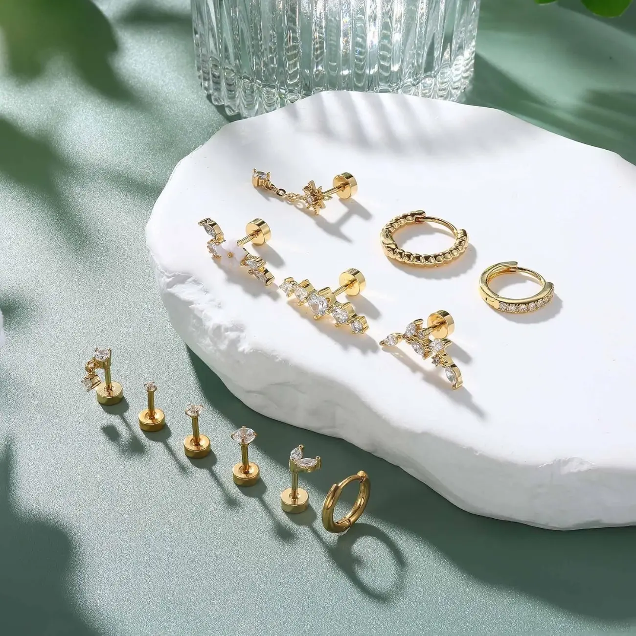·Cartilage Earring Sets for Multiple Piercing---12PCS Single 16G cartilage earrings for women,including 3PCS ear climber earrings,3PCS CZ flat back stud earrings tragus,2PCS dangle helix earrings,3PCS conch hoop piercing jewelry.The piercing earrings set look great worn alone or mixed or matched with other earrings,just enjoy DIY fun with your piercing jewelry