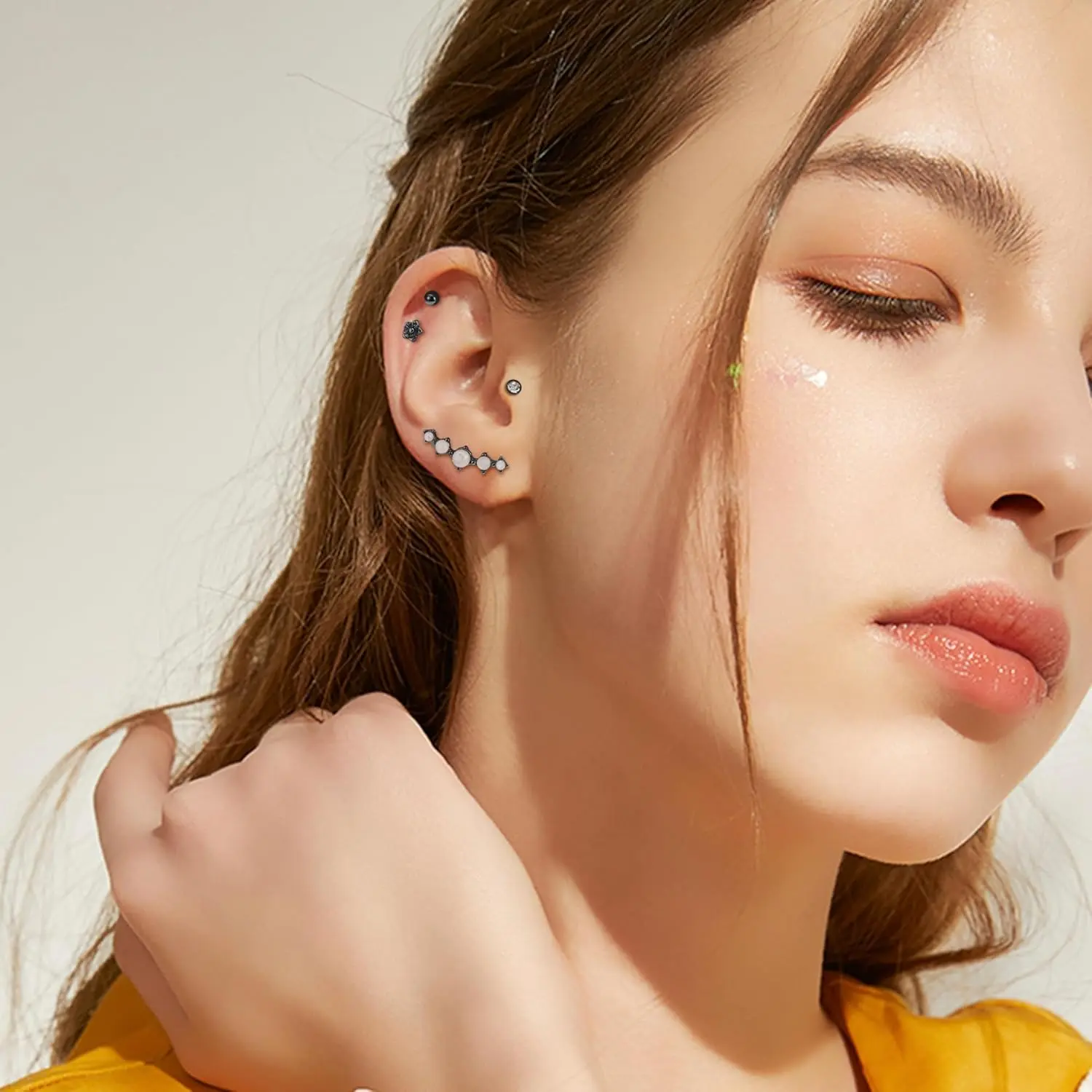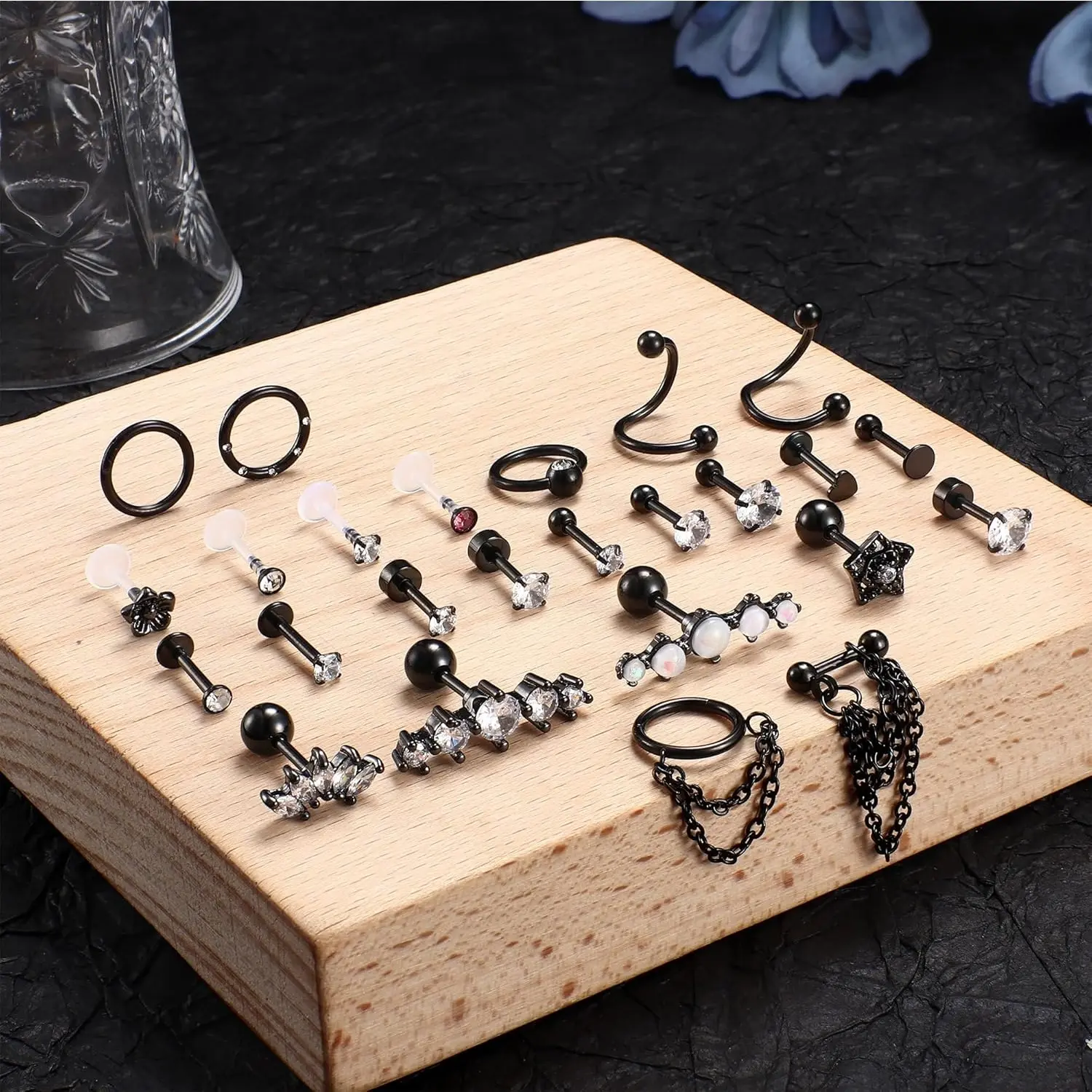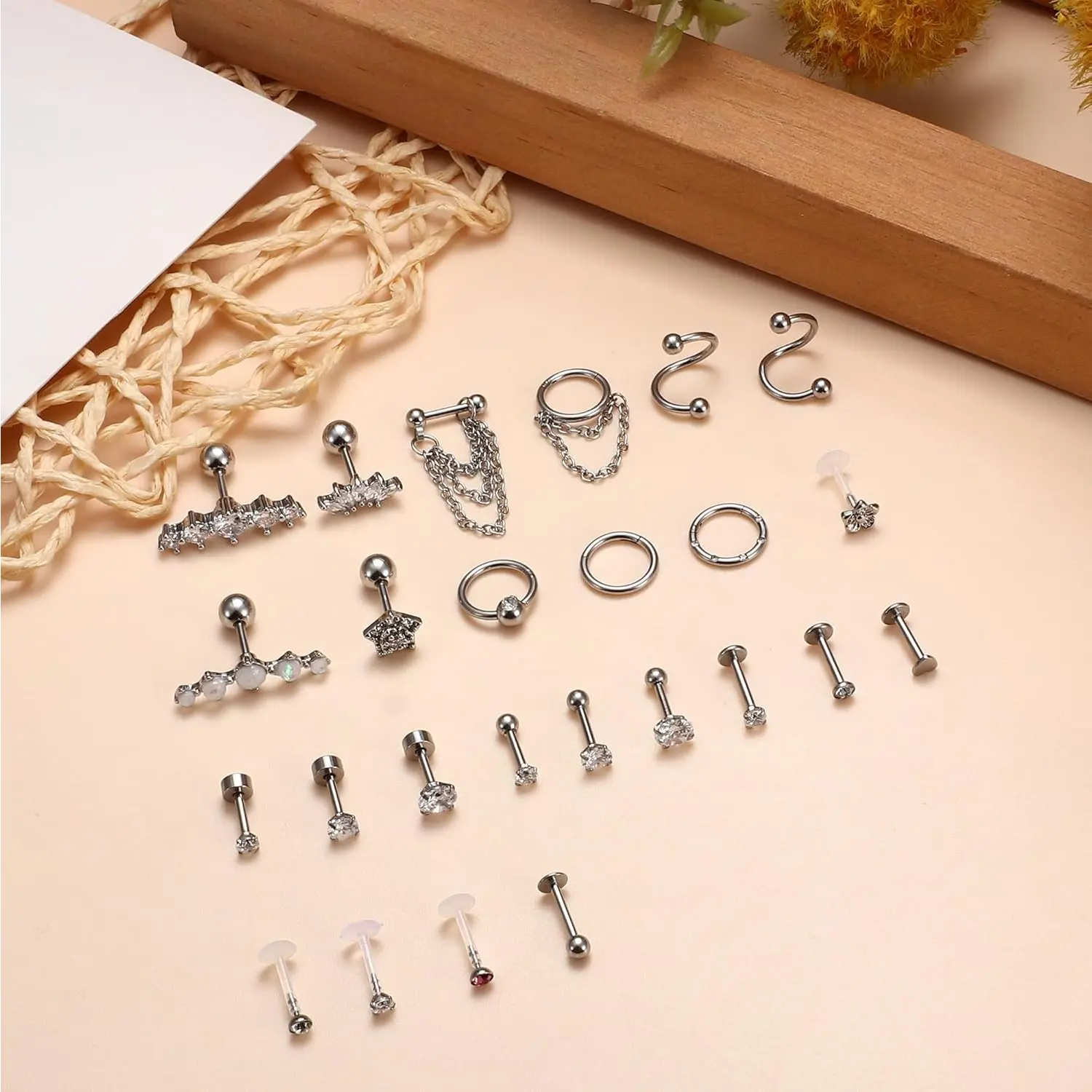 MULTIPLE PIERCING JEWELRY: One order includes 25 count cartilage earrings: 2 count helix hoop with chain; 8 count forward helix stud; 3pcs conch hoop; 6 count ball and flatback cartilage stud; etc.