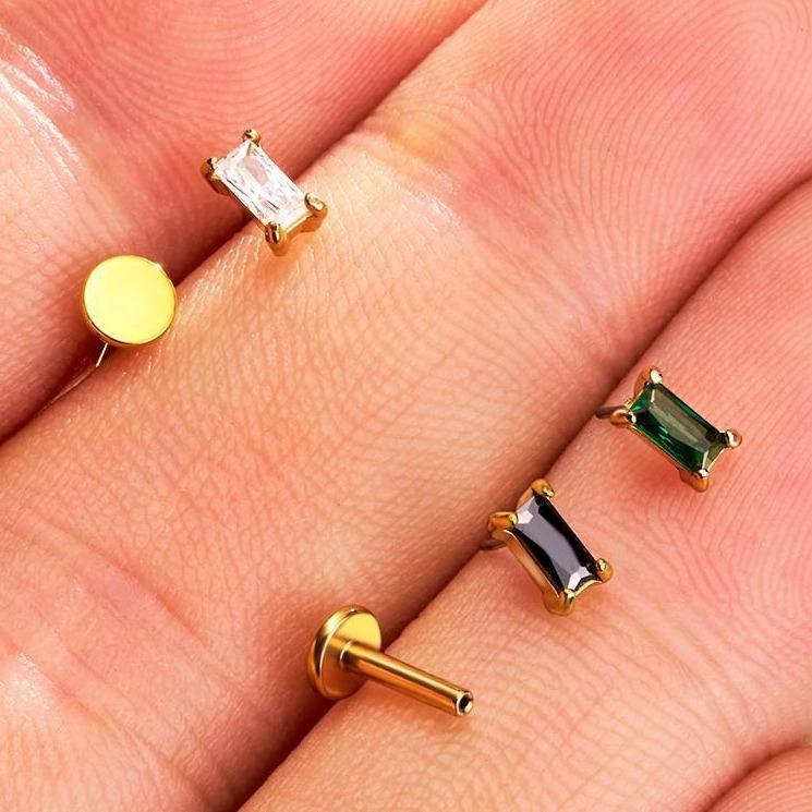 Enhance your daily accessory collection with Oufer 16G Rectangle Threadless/Push Pin Tiny Double CZ Flat Back Cartilage Stud Earring, the perfect addition to any casual outfit.