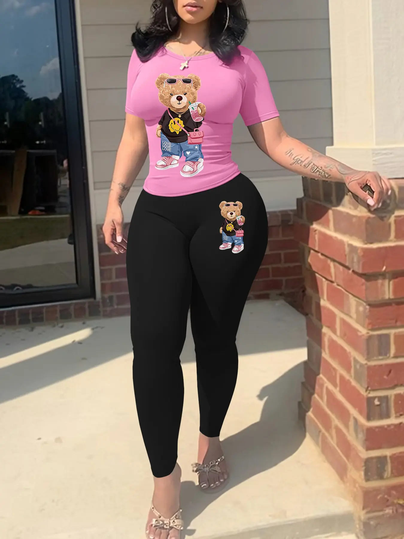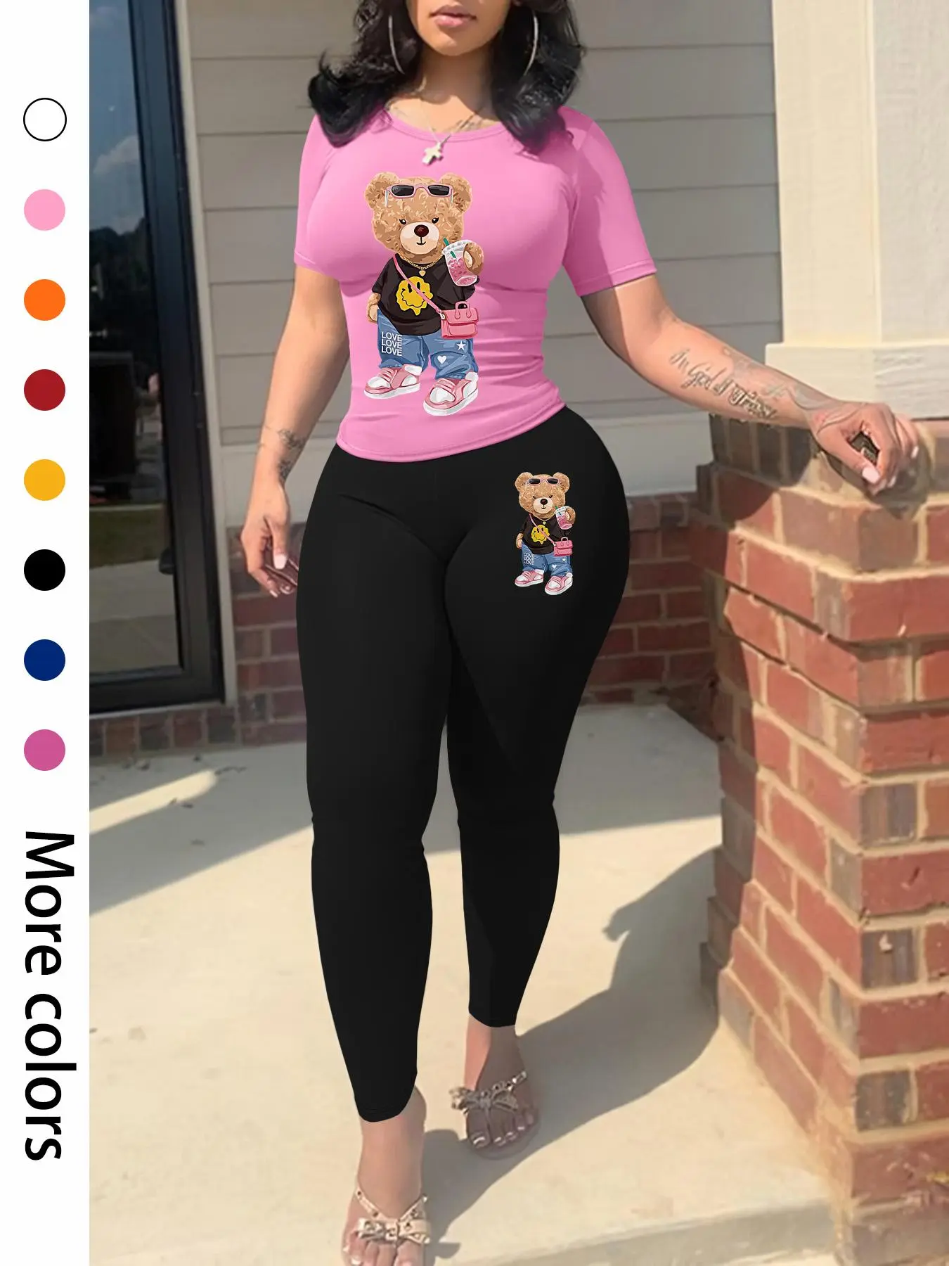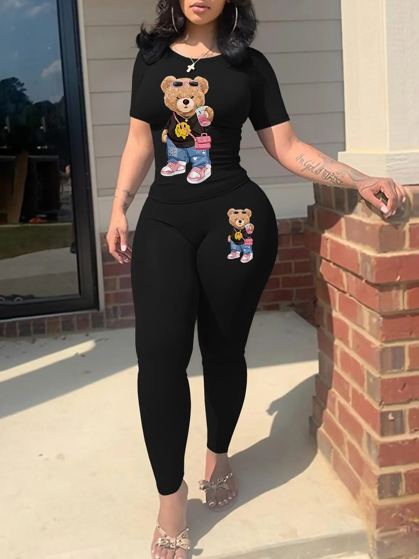 5. Two-piece Set Women's Cartoon Bear Print Short Sleeve Tee & Skinny Pants, Casual Round Neck T-shirt & Trousers for Spring & Fall, Ladies Clothes for Daily Wear