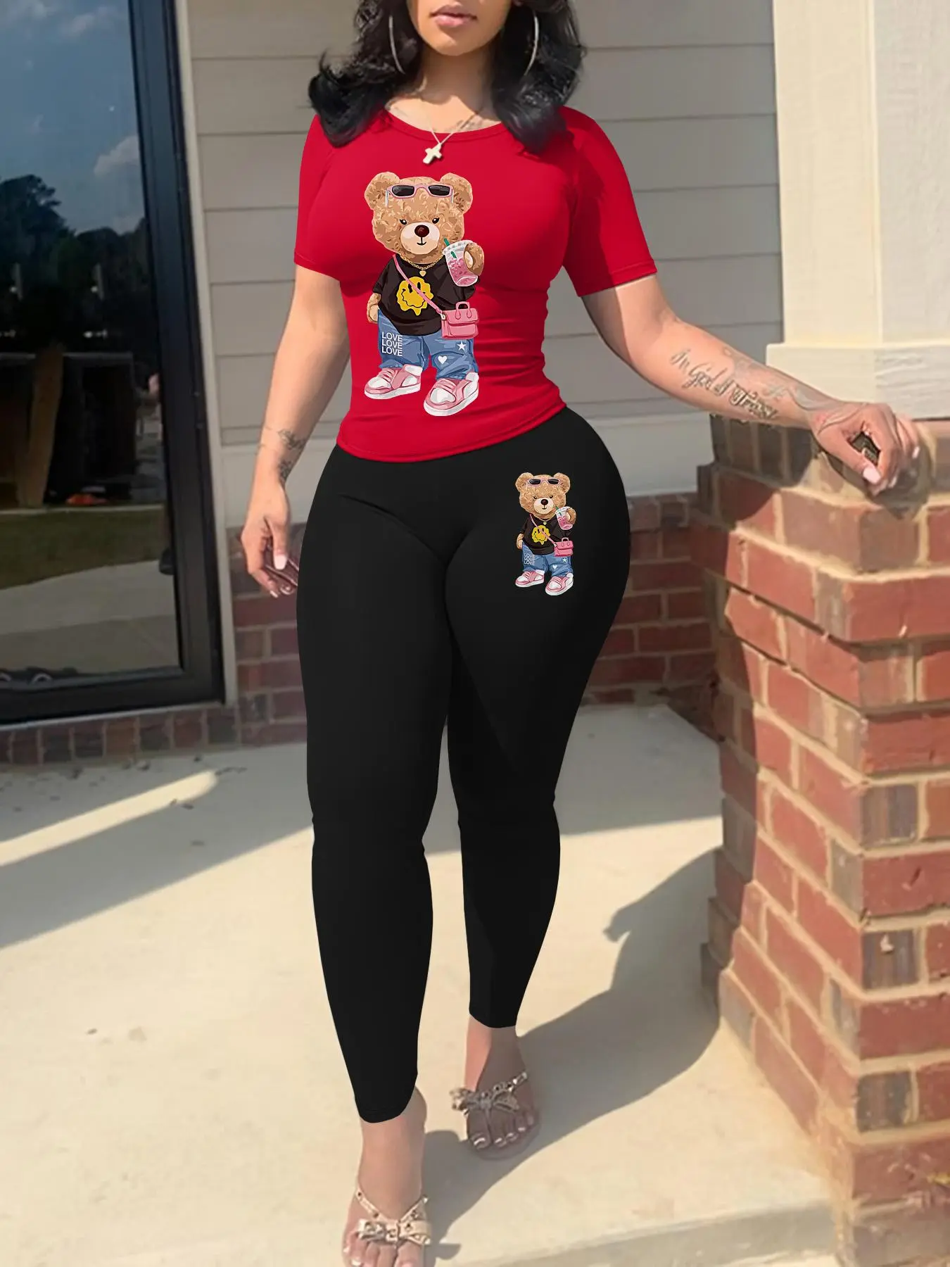 Two-piece Set Women's Cartoon Bear Print Short Sleeve Tee & Skinny Pants, Casual Round Neck T-shirt & Trousers for Spring & Fall, Ladies Clothes for Daily Wear