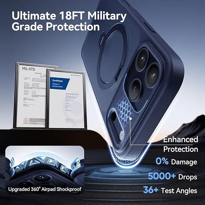 ·[16FT All-Around Protection] Tested over 5,000 times against extreme drops, the MagicStand Case far outlasts ordinary cases. Its shockproof polycarbonate back with AirPad cushioning guards against daily drops and impacts. (MIL-STD-810H 516.8) New for Pro Max: A dedicated Lens module enhances overall protection and improves camera scratch resistance by 50%. Together with the 2.5mm raised lens borders and 1.5mm screen bezel, your phone receives comprehensive defense.