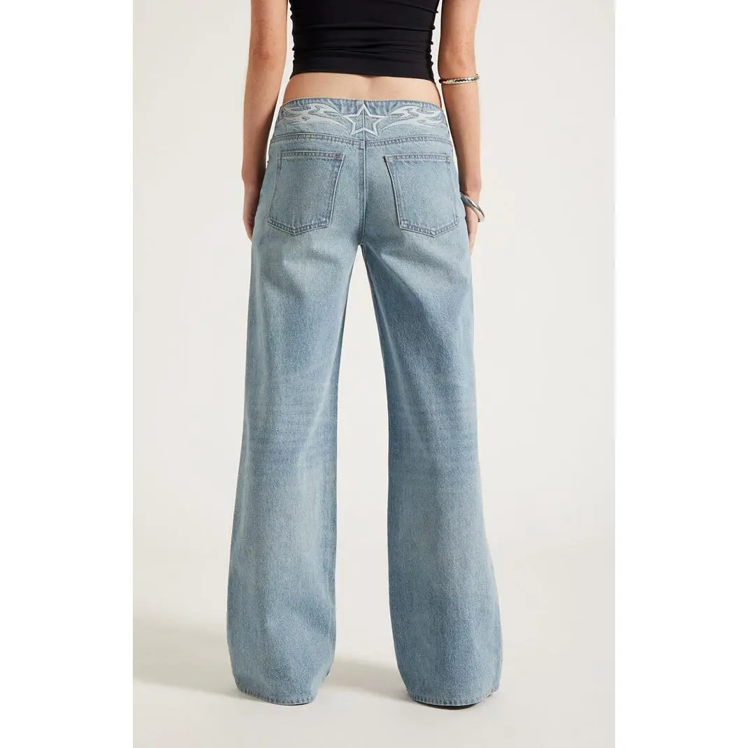 Pacsun Women's Casey Low Rise Baggy Jeans Star Embroidered Light Blue