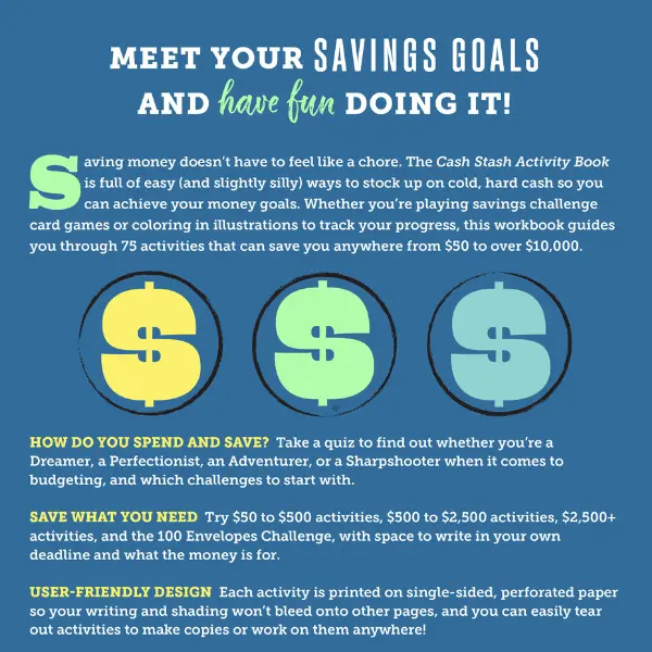 The Cash Stash Activity Book is a motivational and interactive way to save more money! This book contains 75 fun money-saving challenges, designed to help you achieve your financial goals from $50 to $10,000.