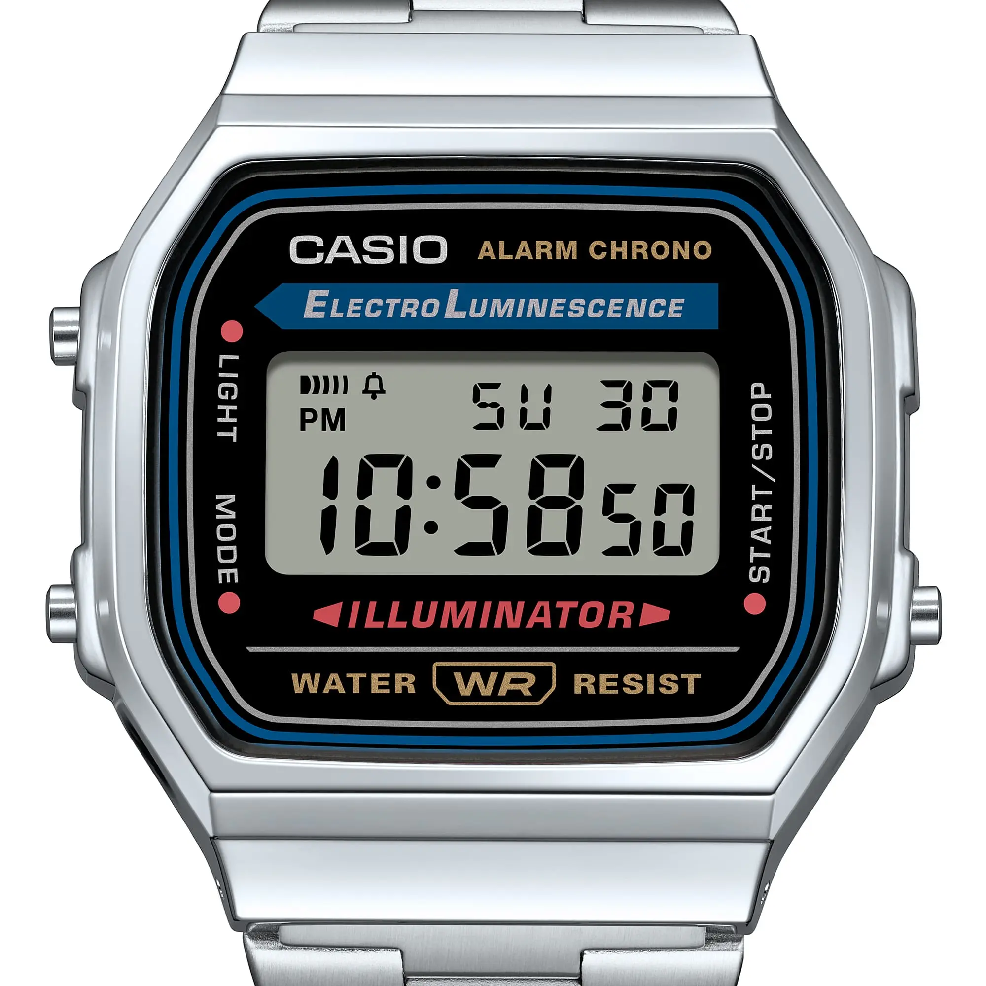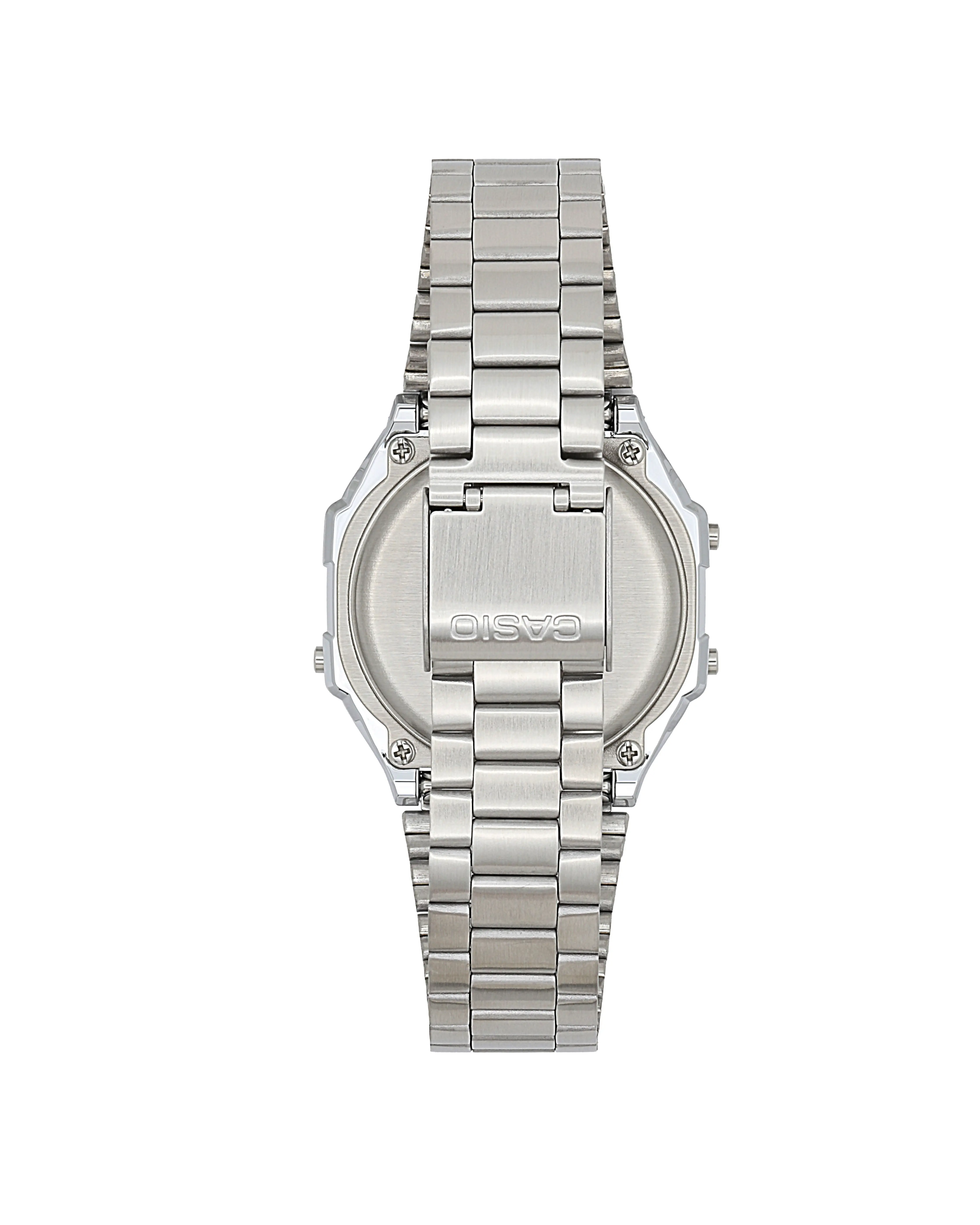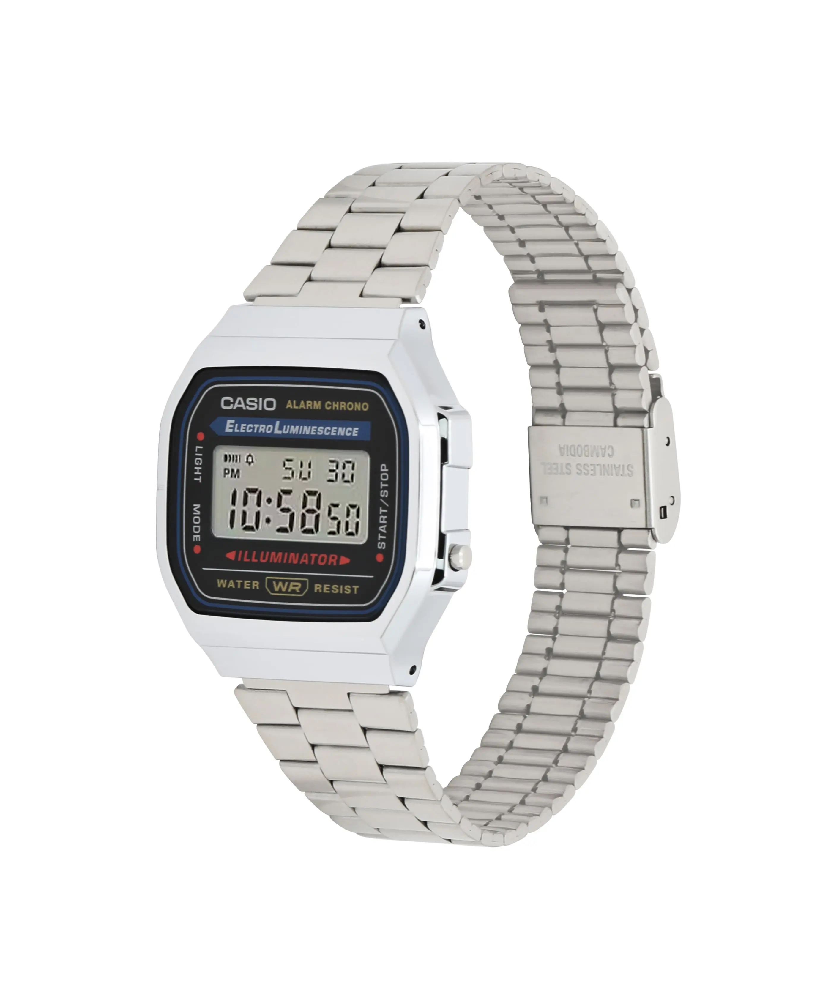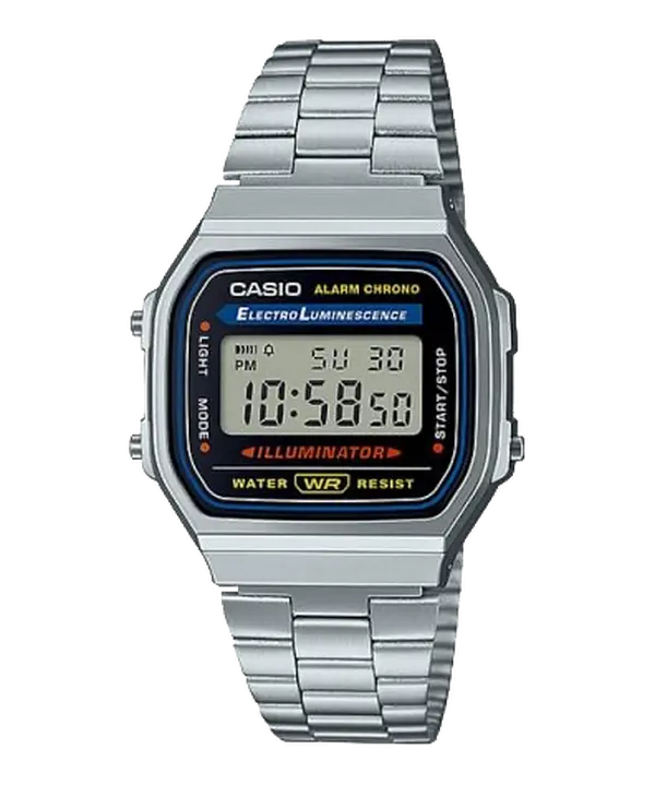 Look no further if you are looking for a silver toned watch that can be both durable and stylish, the CASIO A168W-1 might just be what you're looking for. The A168W-1 is a silver toned digital watch that encompasses everything you need. With a stainless steel band and a stainless steel watch face that is aglow with individuality and looks great on the street fashion scene. So add this silver toned watch to your G-Shock collection or simply make it your next everyday watch. After all, this CASIO digital watch is made to be both highly durable and functional! The A158WA-1 silver toned digital watch includes features like hands and hour markers with large fluorescent areas for easy reading and a reliable screw-lock crown. This men's digital watch also has a battery life of 3 years on CR2016. With its long battery life and reliable performance, this CASIO men's digital watch is perfect for those who want a stylish yet multifunctional watch. A simple metal watch that is easy to coordinate with outfits.