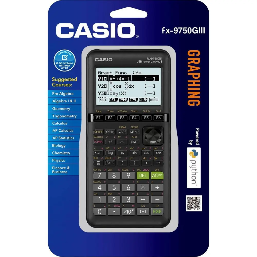 Casio FX-9750GIII 3rd Edition Graphing Calculator with sleek new design and slide on hard case. With all the standard features of an entry-level graphing calculator, the FX-9750GIII supports students and educators from middle school to high school and into college. Its icon-based menu is easy to navigate and the soft-menus make it easy to access functionality for common tasks. The intuitive software design facilitates a student's grasp of mathematical concepts, by encouraging student engagement with mathematics, rather than the memorization of keys to effectively promote student success. Suggested Courses: Pre-Algebra, Algebra I & II, Geometry, Trigonometry, AP Calculus, AP Statistics, Biology, Physics,Business & Finance. 62KB Memory (Bytes). 3MB Storage Memory (Flash Memory). Powered by 4 AAA batteries (included). Dimensions: W 3.6 x L 7.25 x H .83 Inches .75 lbs. Color black.