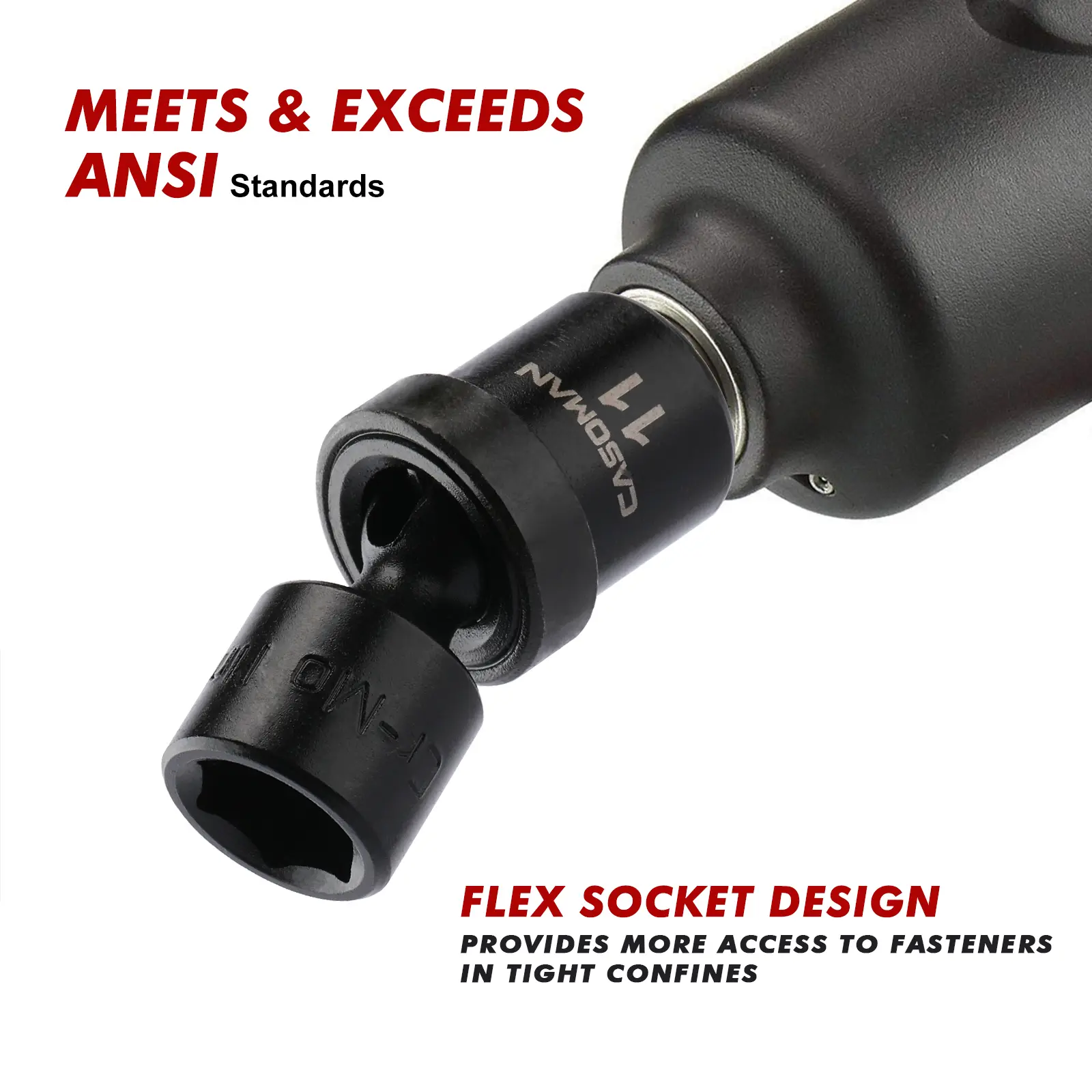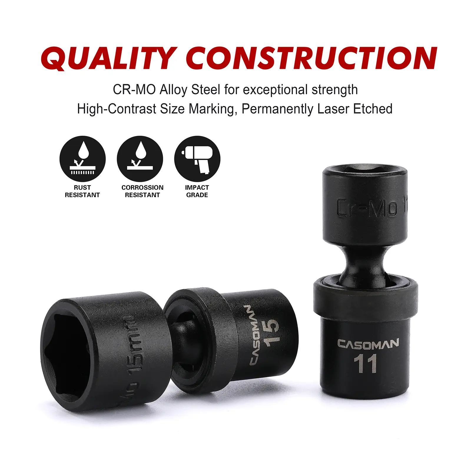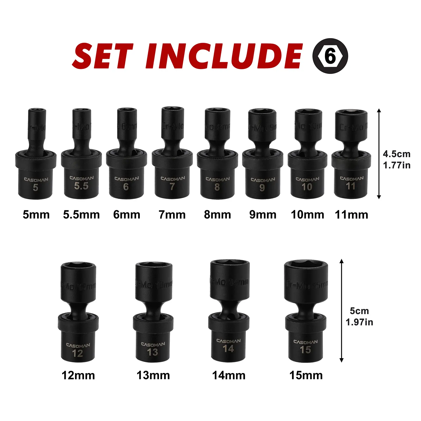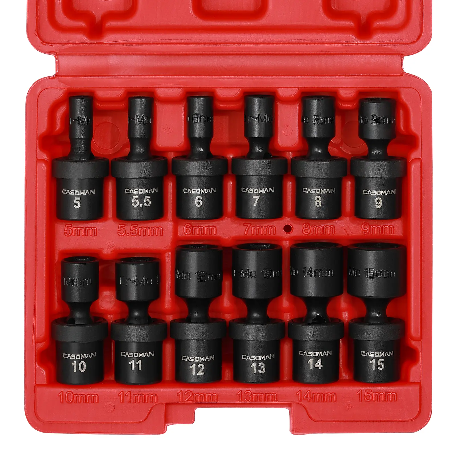 CASOMAN 1/4-Inch Drive Shallow Universal Impact Socket Set, Metric, 12 Pieces Set, 5mm to 15mm, 6-Point, Cr-Mo, Impact Grade. Manufactured from premium impact grade chrome molybdenum steel construction with corrosion-resistant black phosphate finish for durability. Flex socket design allows a full 360° of freedom for the universal head to angle and rotate.