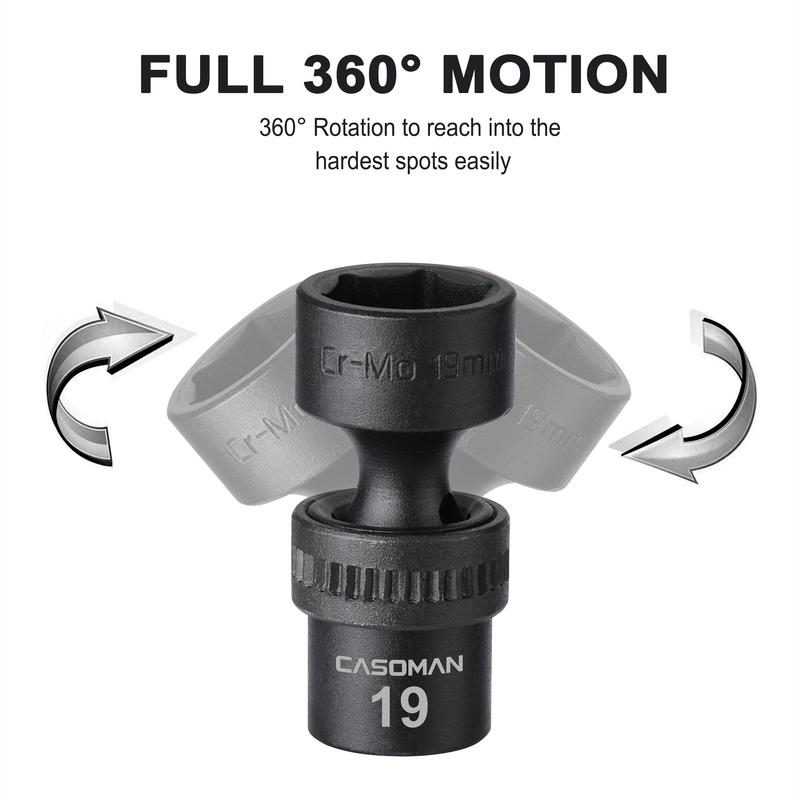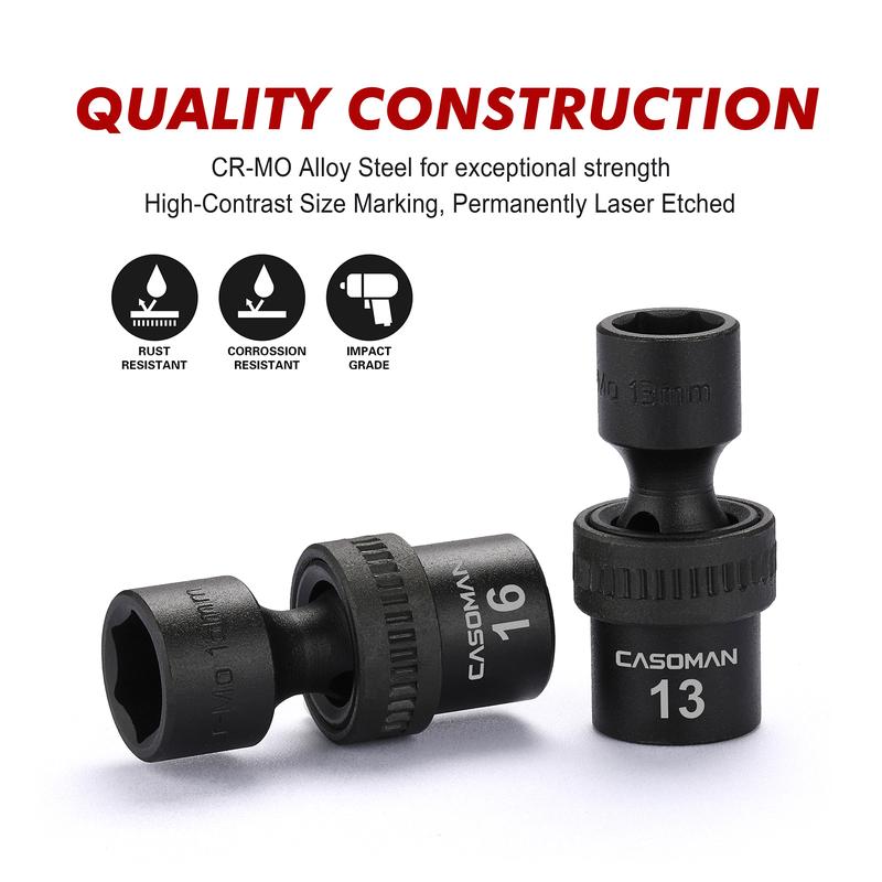 This CASOMAN 15 Piece 3/8" Drive Shallow Universal Impact Socket Set, which is made from premium impact grade chrome molybdenum steel construction with corrosion-resistant black phosphate finish for durability. The flex socket design allows a full 360° of freedom for the universal head to angle and rotate. It is high-contrast size marking is permanently laser and easy to read, even in low light.