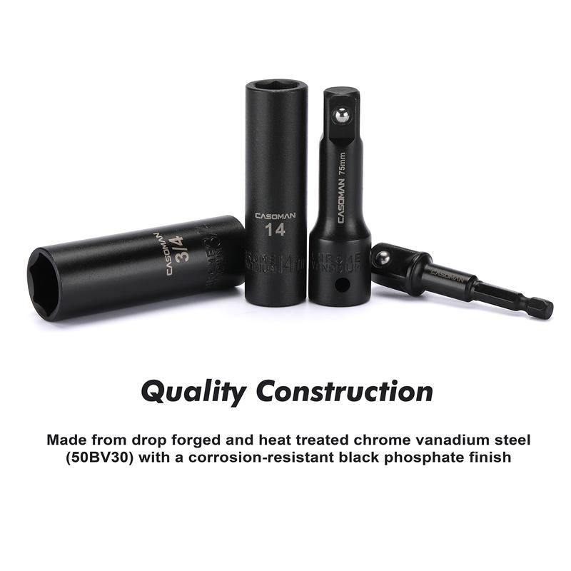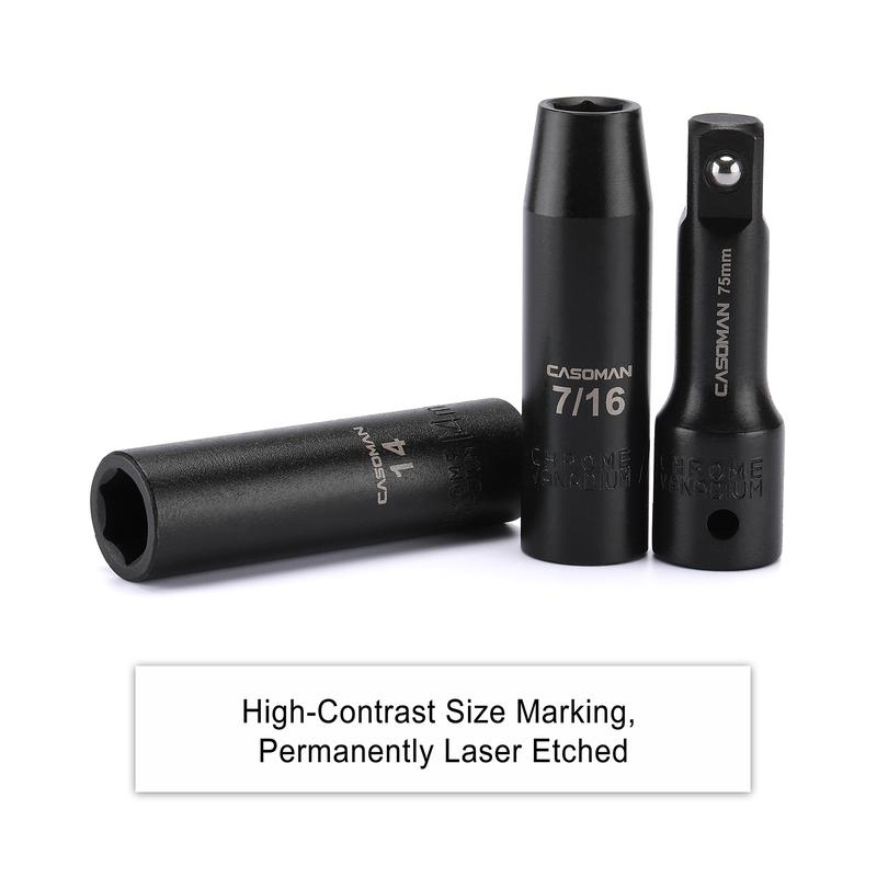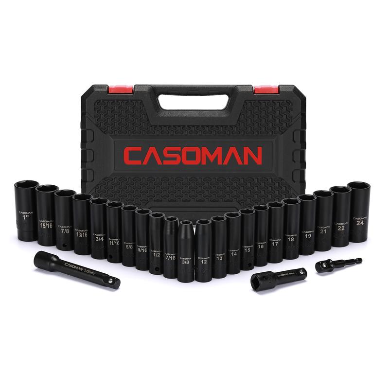 The CASOMAN 25PCS 1/2" Drive Impact Socket Set is made from drop forged and heat treated chrome vanadium steel with a corrosion-resistant black phosphate finish. 6-point flank drive design grips fastener more tightly on the flat sides and prevents rounding off at corners. Permanent high visibility laser etched size marking on each socket for quick size selection when working.