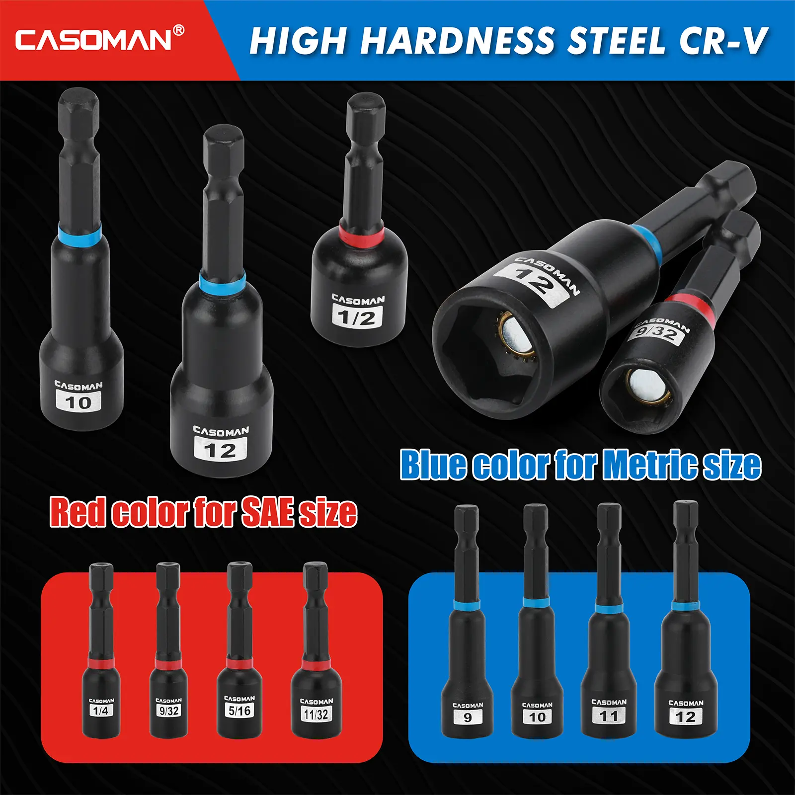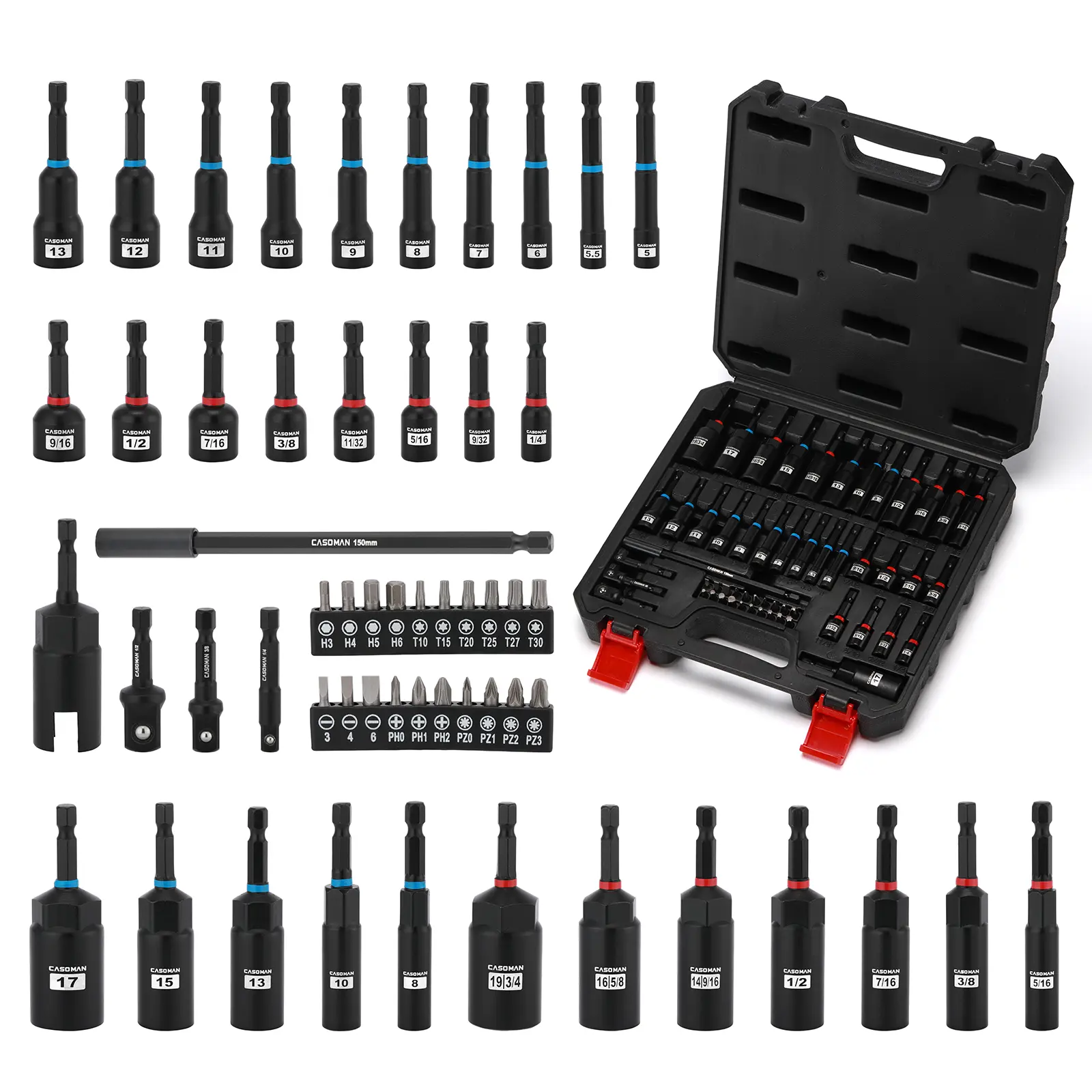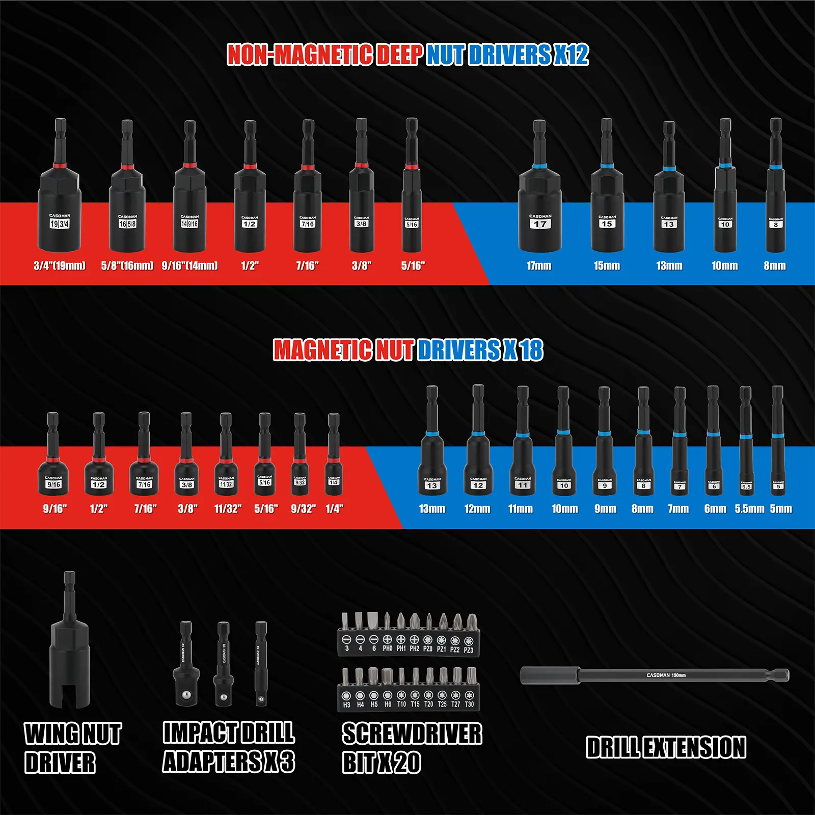 Awesome set of nut driver bits. I was hoping that all of the bits where magnetic but 12 are not. It came with adapters and other bits as displayed. Not a bad kit for the price. Shipping was with no delay.