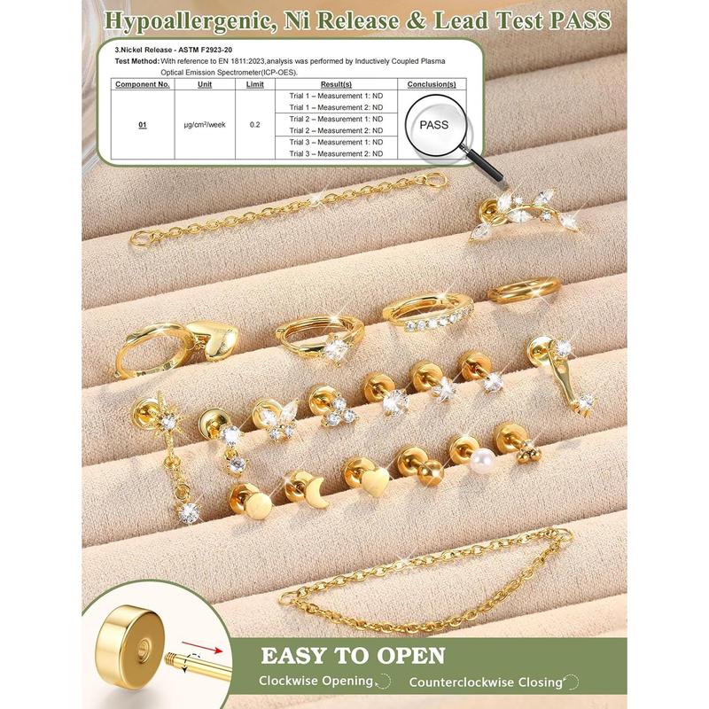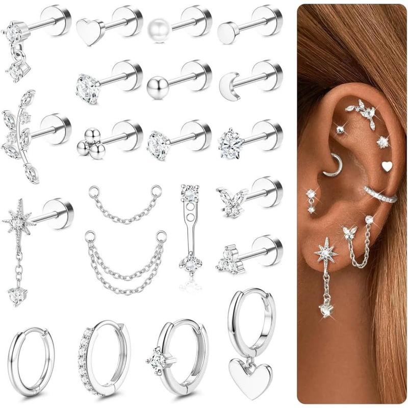 5. CASSIECA 21Pcs Piercing Ear Surgical Steel Helix Piercings Gold Silver Hoop Earrings Stud Set Cartilage Earrings Tragus Conch Helix Piercing Ear Jewelry
