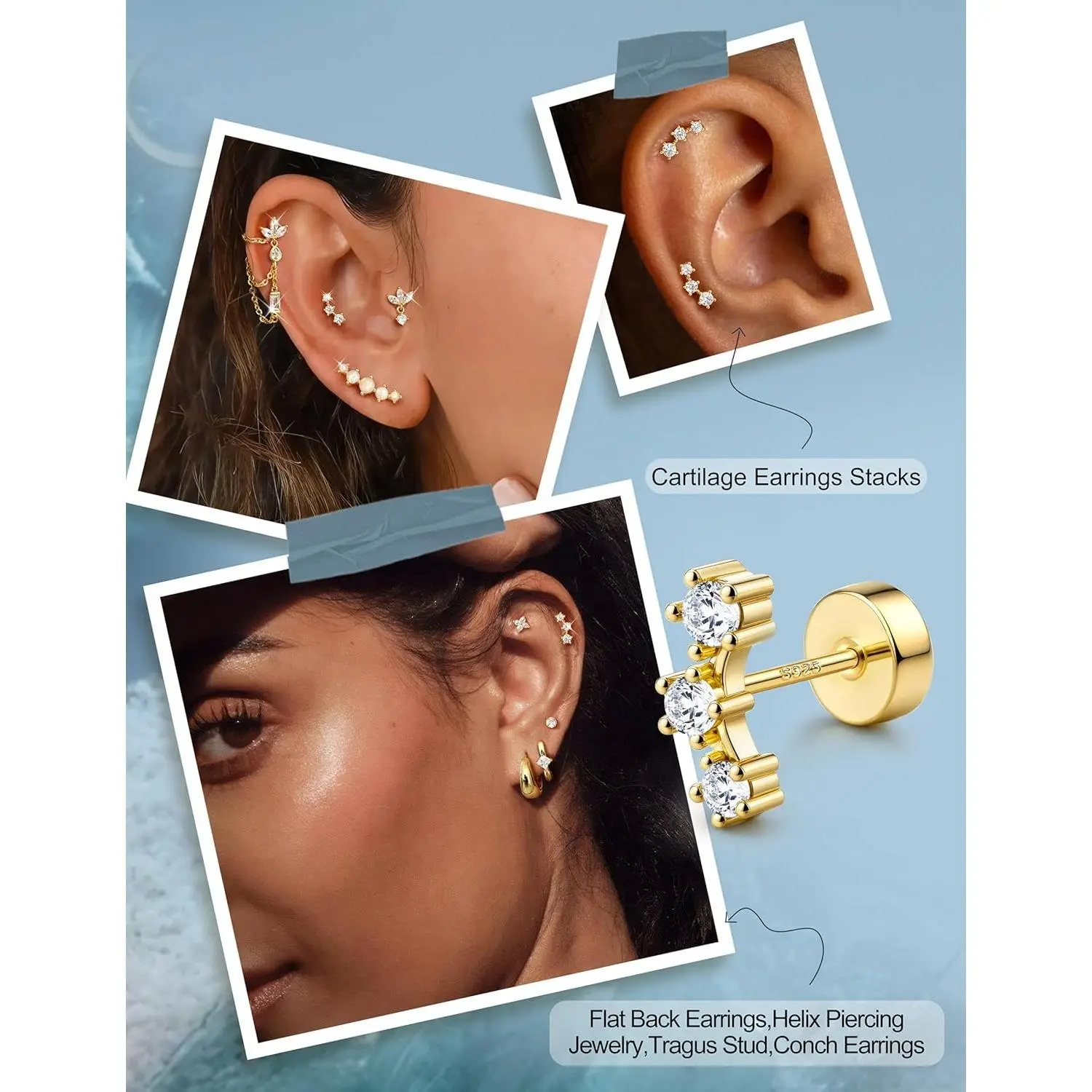 ·【20G Silver Stud Earrings Size】--Flat back studs:gauge:20G(0.8mm),post length:6mm. Flat back cartilage earring features a standard size for a classic and versatile fit. Luxury 14K plated gold or classic silver stud earrings-take your pick.Dainty cartilage earrings for women, variety of styles, well fitted wear alone or stackable cartilage earring. Hypoallergenic earrings for women trendy, DIY your own ear look