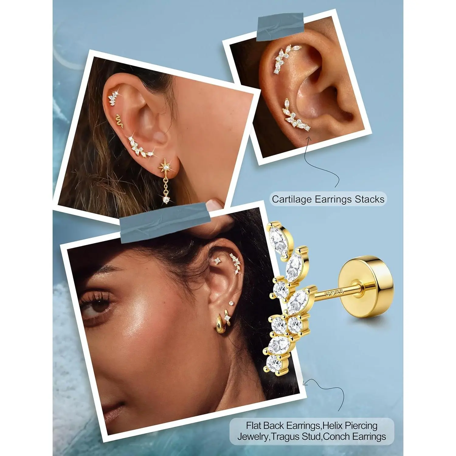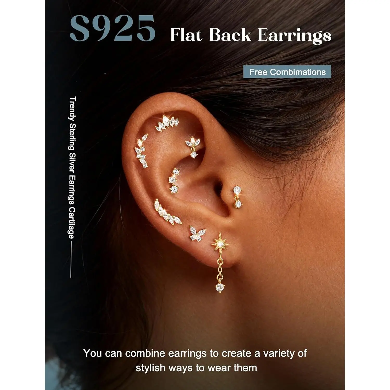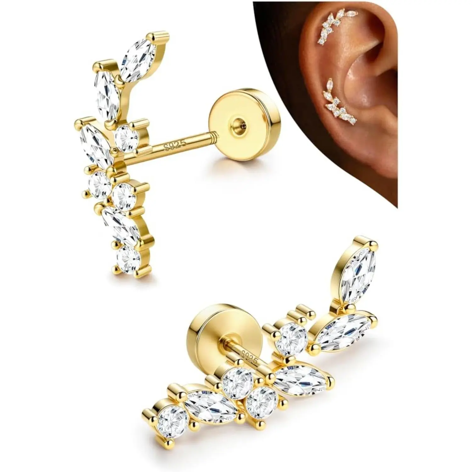 ·【Crawler Cartilage Earrings for Women Flat Back-Diverse Styles】--Trendy flat back earrings for women studs, 15 styles of cartilage earring collection for endless mix & match, including butterfly flat back stud earrings, dangle tragus earrings, olive leaf climber cartilage earrings for women, marquise-cut crown CZ helix piercing jewelry, small conch piercing studs and so on. Hypoallergenic 925 sterling silver earrings with real 14K plated gold studs, rom day to night, wear alone or match to create your perfect ear stacks