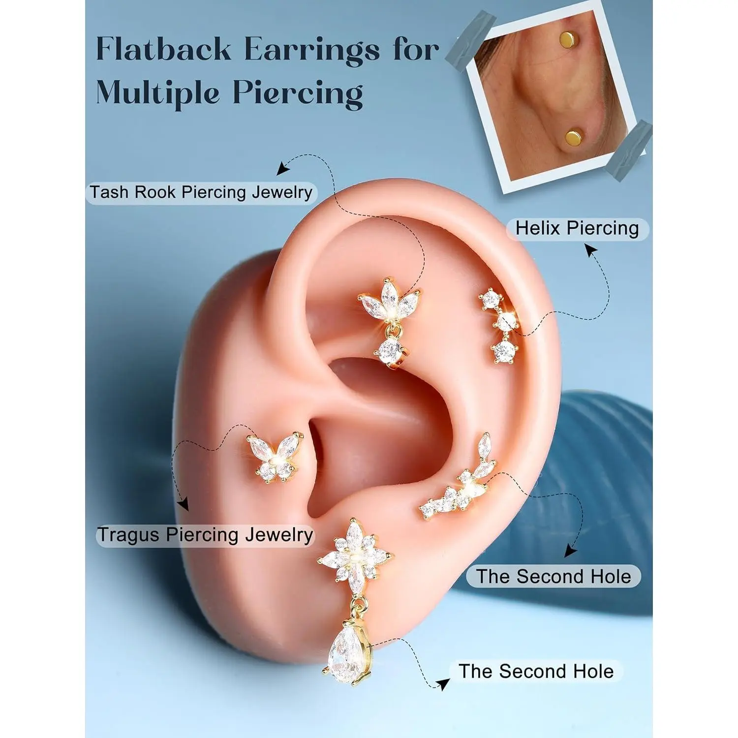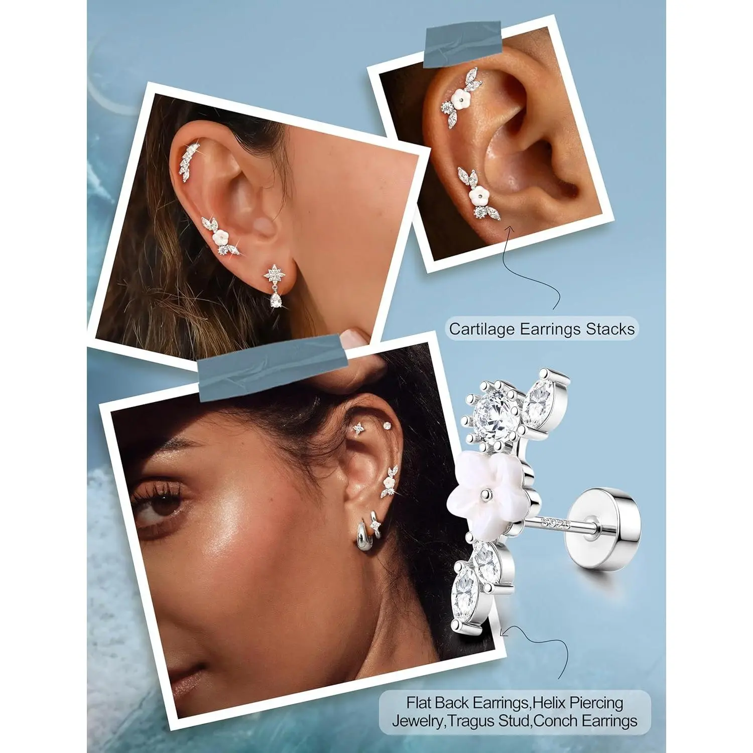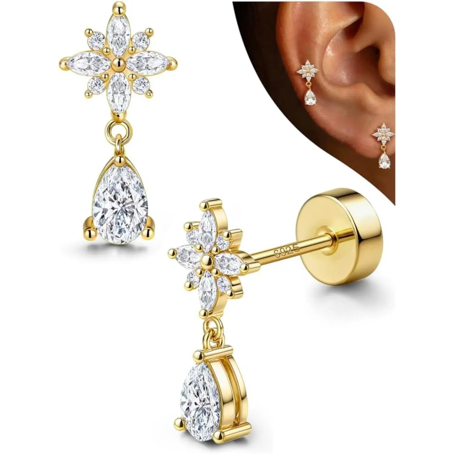 ·【Crawler Cartilage Earrings for Women Flat Back-Diverse Styles】--Trendy flat back earrings for women studs, 15 styles of cartilage earring collection for endless mix & match, including butterfly flat back stud earrings, dangle tragus earrings, olive leaf climber cartilage earrings for women, marquise-cut crown CZ helix piercing jewelry, small conch piercing studs and so on. Hypoallergenic 925 sterling silver earrings with real 14K plated gold studs, rom day to night, wear alone or match to create your perfect ear stacks