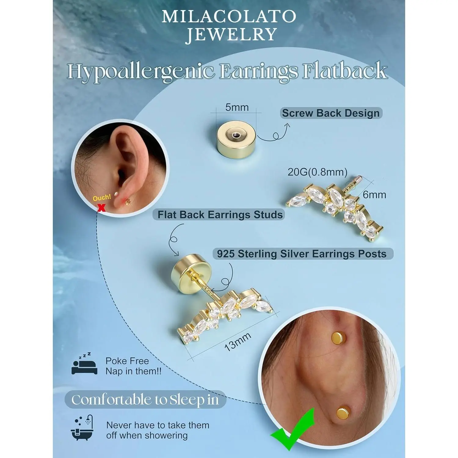 ·【Flat Back Earrings for Women-Comfortable Nap Earrings】--925 Sterling silver stud earrings, screw back earrings with flat backs,easy to screw on and take off, won't easy to slip off. Comfy flatback earrings, poke free, comfortable sleeper earrings, suitable for 24/7 WEAR. Cartilage earrings for women, perfect for earring stacks, suitable for daily wearing, provide seamless comfort for any activity, even when sleeping,playing, working, exercising