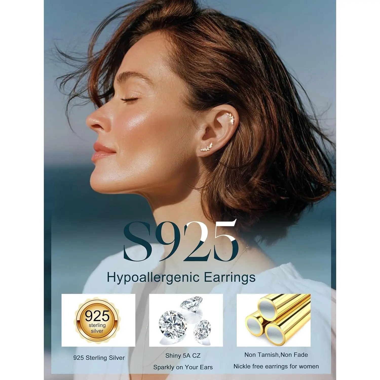 ·【Hypoallergenic Earrings-925 Sterling Silver Post Stud Earrings】--925 sterling silver post stud flat back earrings,lead & nickle free, no irritation, perfect hypoallergenic earrings for women for sensitive ears. Real 14K plated gold stud cartilage earring,waterproof earrings, non tarnish & no fading. 5A CZ is set flush in the dainty ear crawler earrings with flat backs, sparkly on your ear, durable, long-lasting shiny