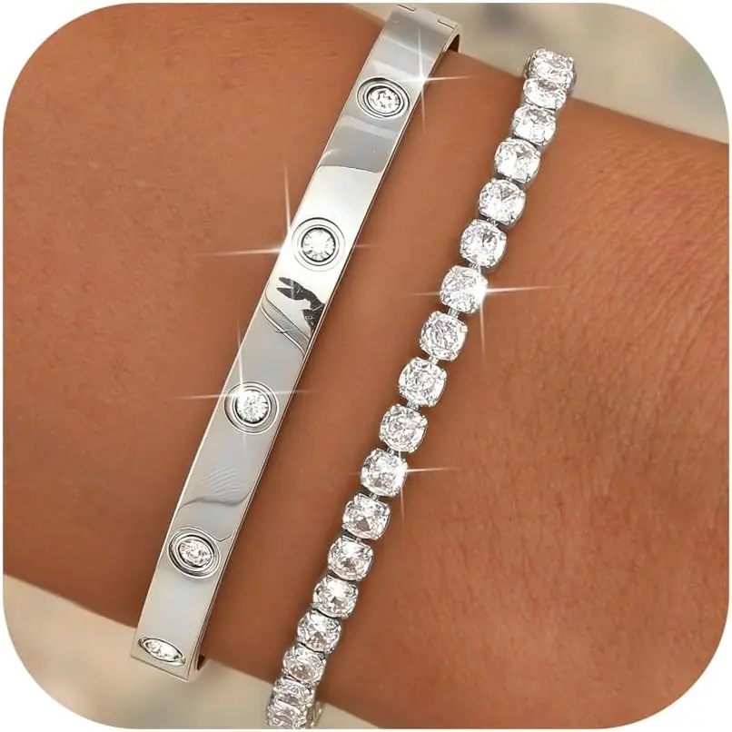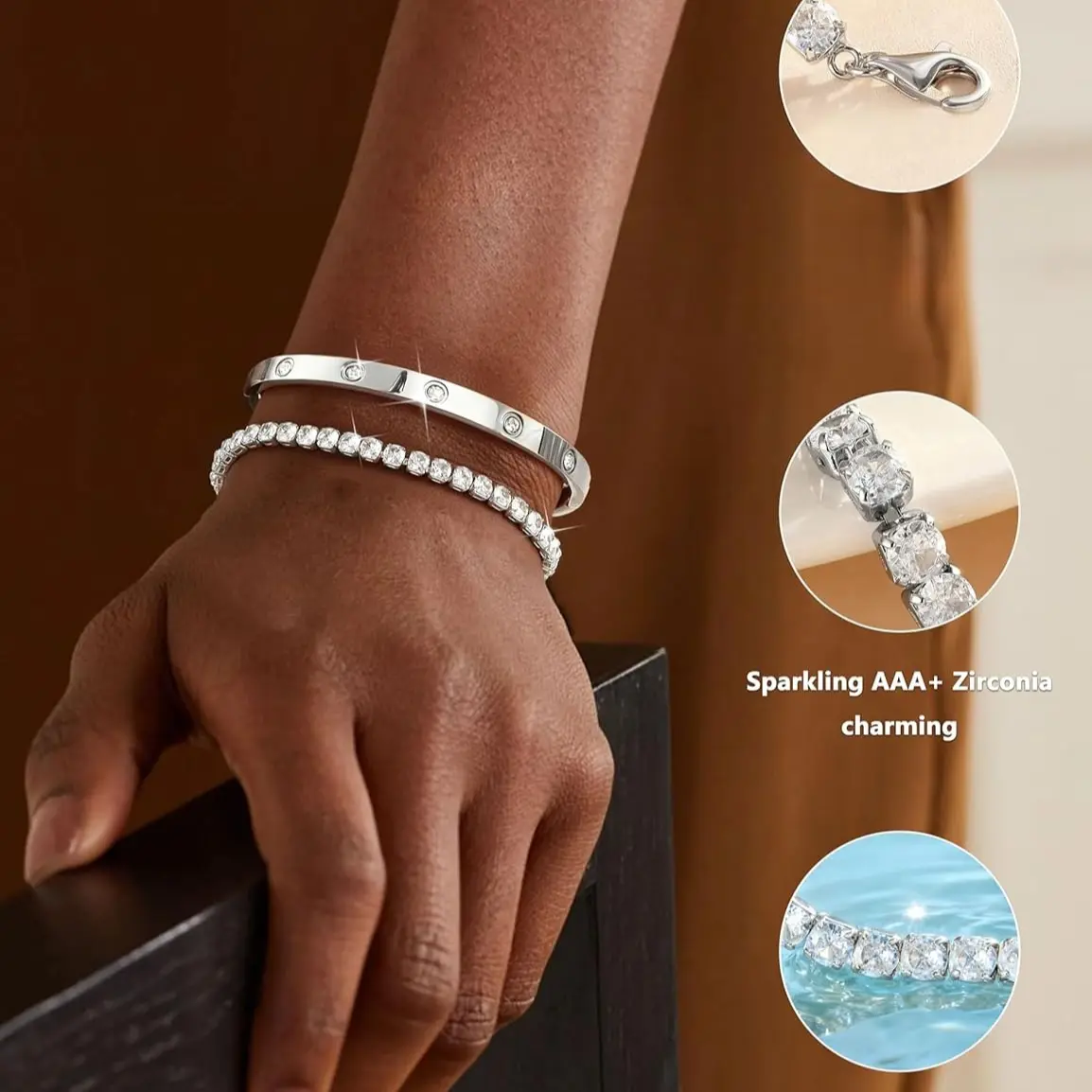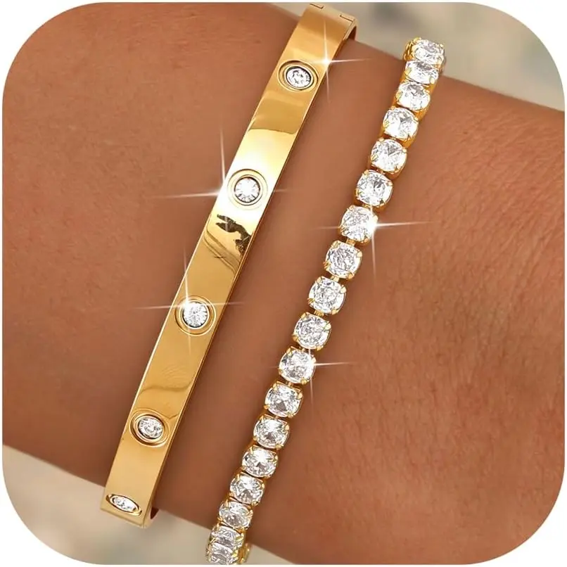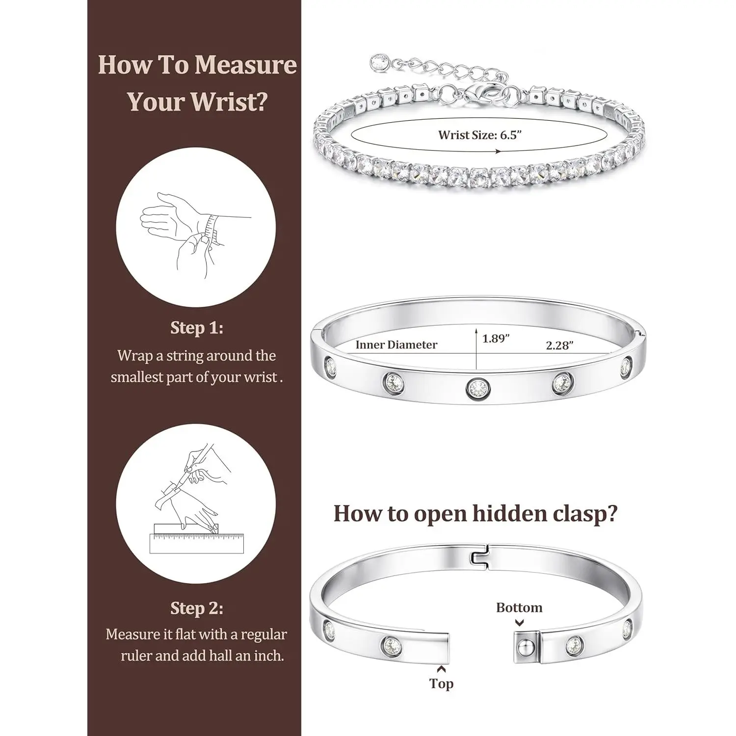 【Comfortable Fit】The minimalist gold bangle for women is available in 7 inch, and the cubic zirconia tennis bracelet is 6.5 inch with 2 inch extension.