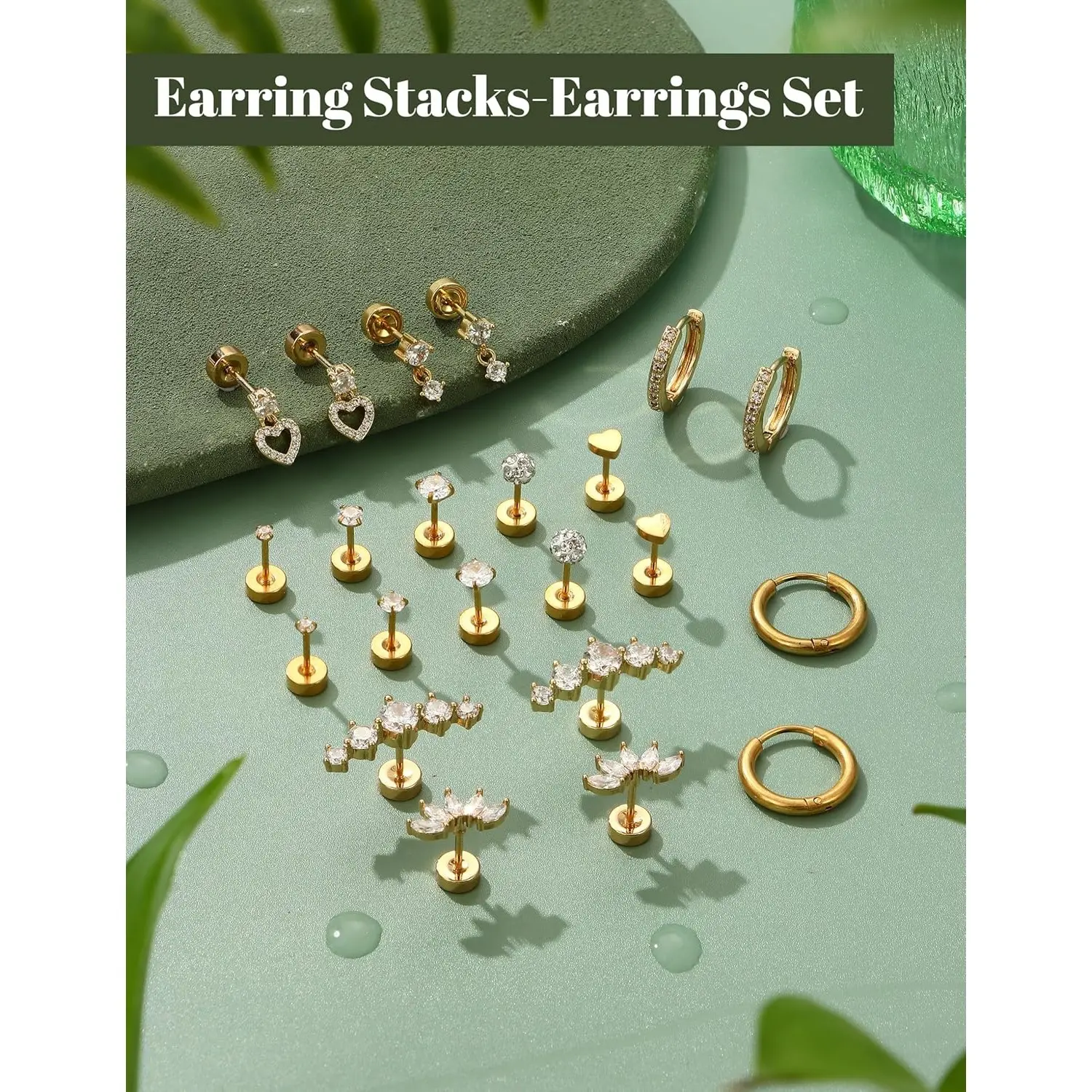 5. 【Flat Back Earring Stacks】--Flat back cartilage earring sets for multiple piercing,hypoallergenic surgical steel earrings,trendy studs & hoops gold earrings sets for multiple piercing,such as lobe earrings,the second lobe earrings,cartilage earrings for women,tragus/helix/conch/daith piercing jewelry