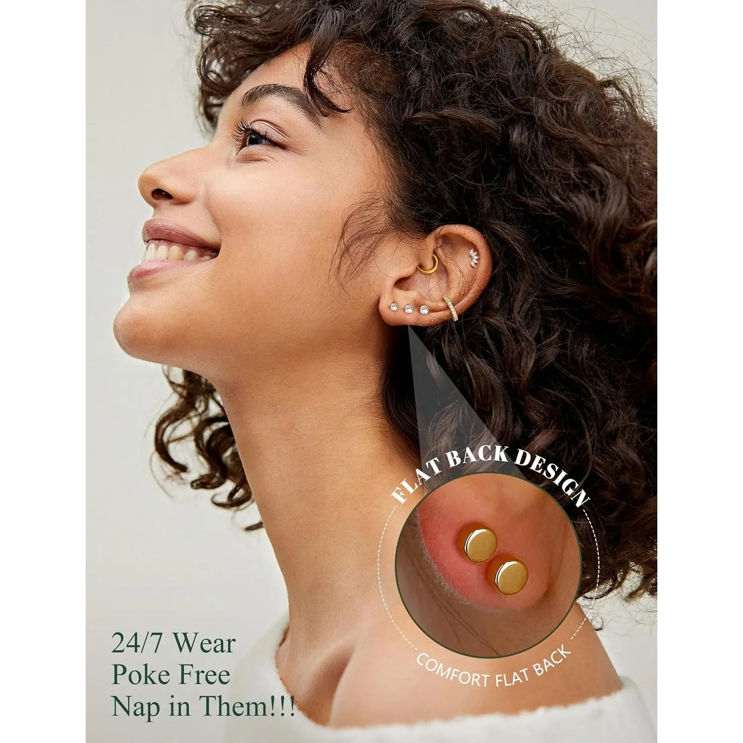 3. 【Comfy Flat Back Earring】--Flat back stud earrings,screw back design,easy to screw on and take off,flatback nap earrings,POKE FREE,won't easy to slip off.Comfortable to wear,suitable for 24/7 wear,cartilage earring perfect for daily wearing,even when sleeping,playing,working,exercising
