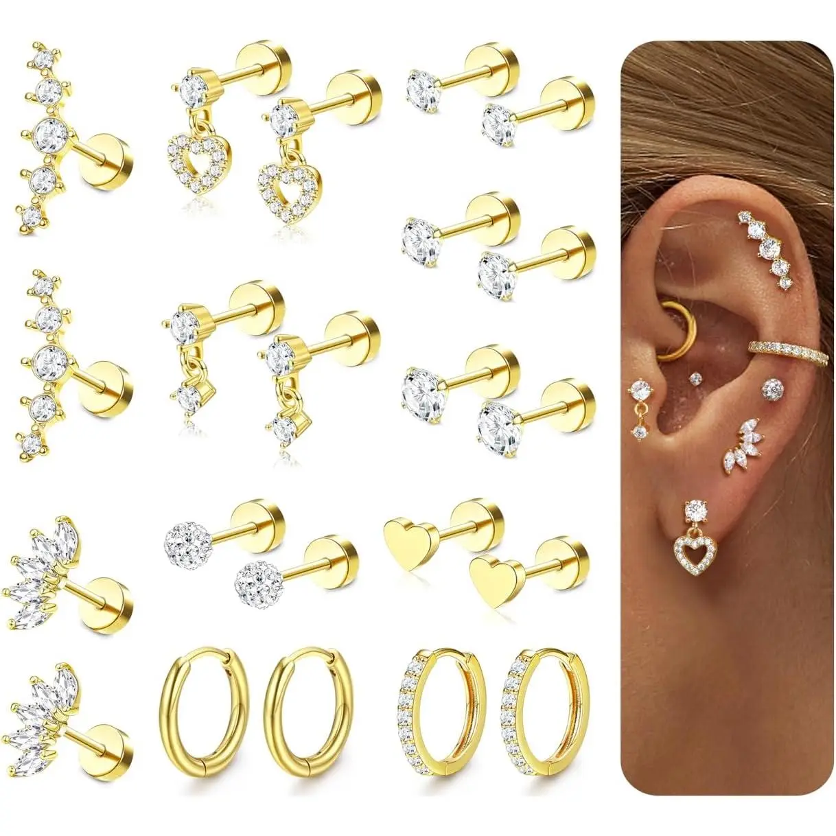 CASSIECA  Hypoallergenic Flat Back Earrings for Women Cartilage Earrings Stacks-20G Surgical Stainless Steel Flatback Stud Hoop Earring Set Daith Conch Tragus Helix Piercing Jewelry #girljewelry #jewelryaddict #nosejewelrycollection #14kgoldheartearrings #hypoallergenicearrings #ezjewelry #goldjewlerygirl #uniqueearrings #nicejewelry #elaynejewelry