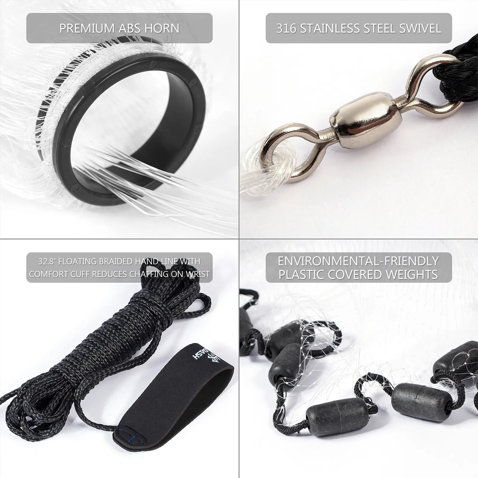 ·Constructed with premium copolymer monofilament mesh, environmental-friendly plastic covered weights, 316 stainless steel swivel, and durable ABS horn