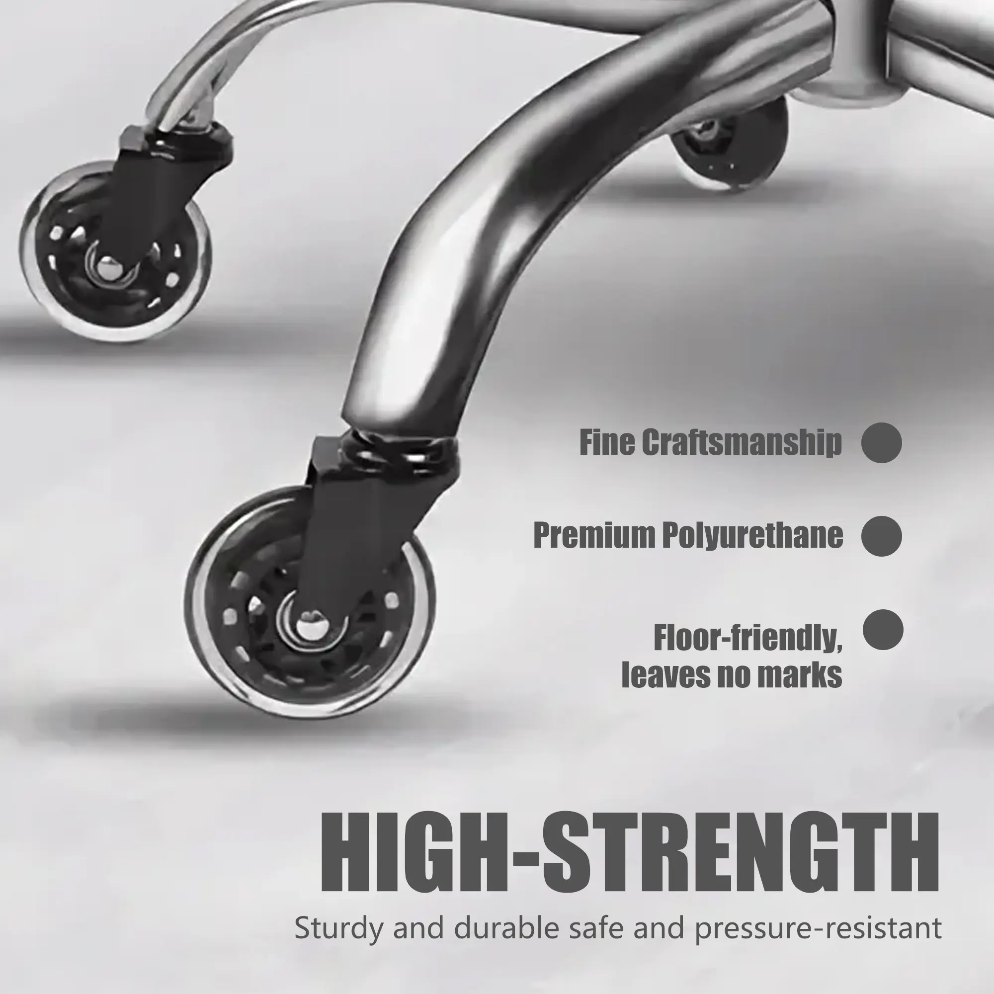 The wheels look solid in construction, super easy to install and my chair rolls so much smoother now and I am not worried about them cracking and breaking like the standard plastic wheels that came with the chair. Makes the base of the chair just roll instead of it twirling when I moved around.