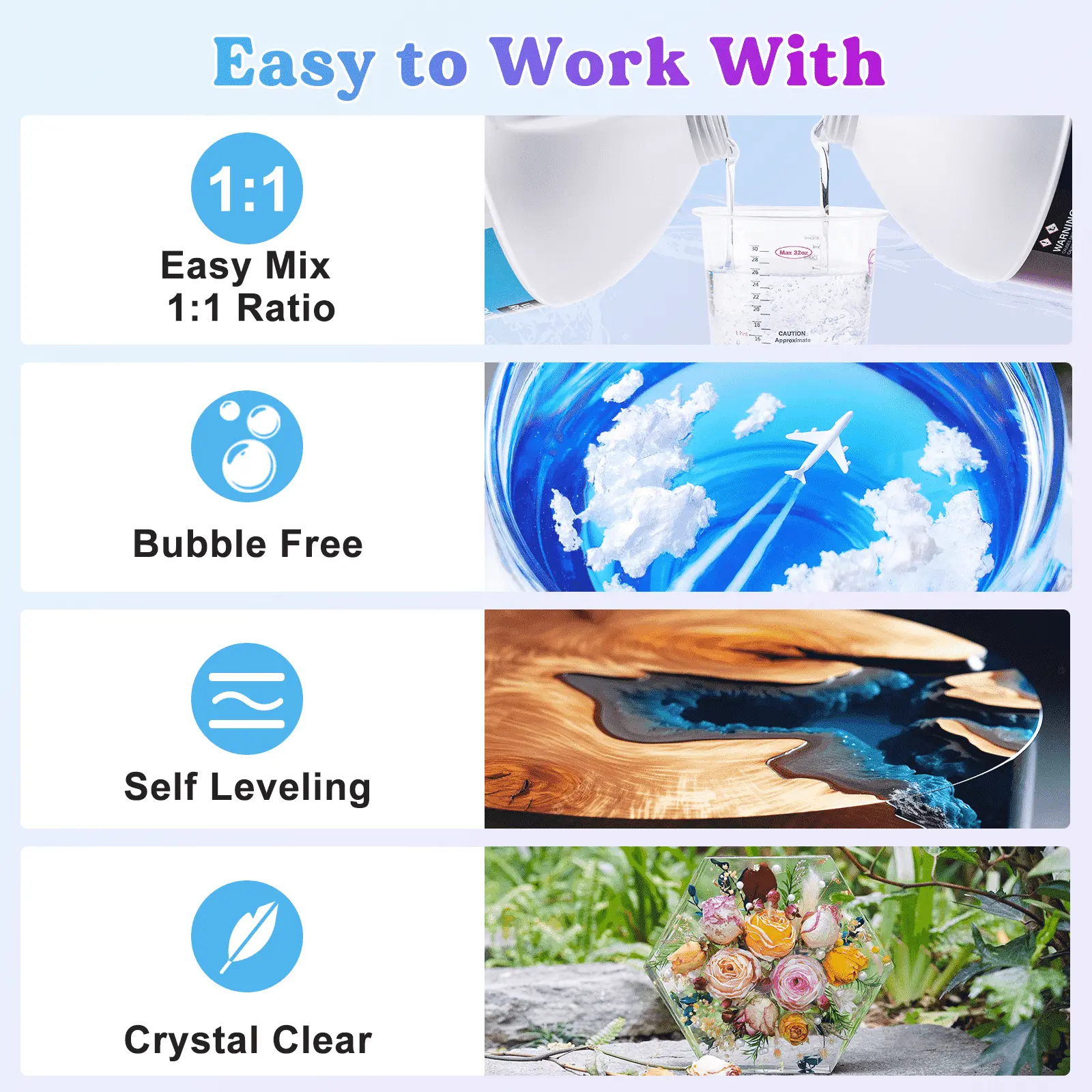 ·Crystal Clear & High Gloss Finish: Our clear epoxy resin is made of safe and high quality materials, which have undergone multiple experiments and improvements. An excellent UV Resistant formula that can make your art vibrant, long-lasting, scratch resistant, moisture-resistant, rock hard, and have a glass like surface treatment, long-lasting, ultra transparent appearance, and will not turn yellow.
