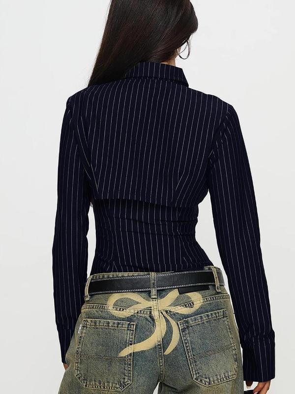Women's Striped Print Cut Out Shirt, Button Up Shirt, Casual Blouse Shirts, Casual Long Sleeve Collared Top for Spring & Fall, Ladies Clothes for Daily Wear