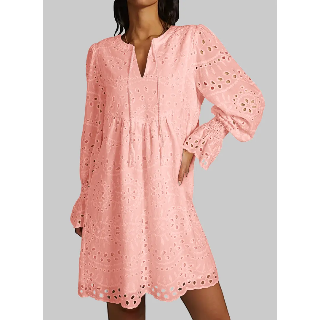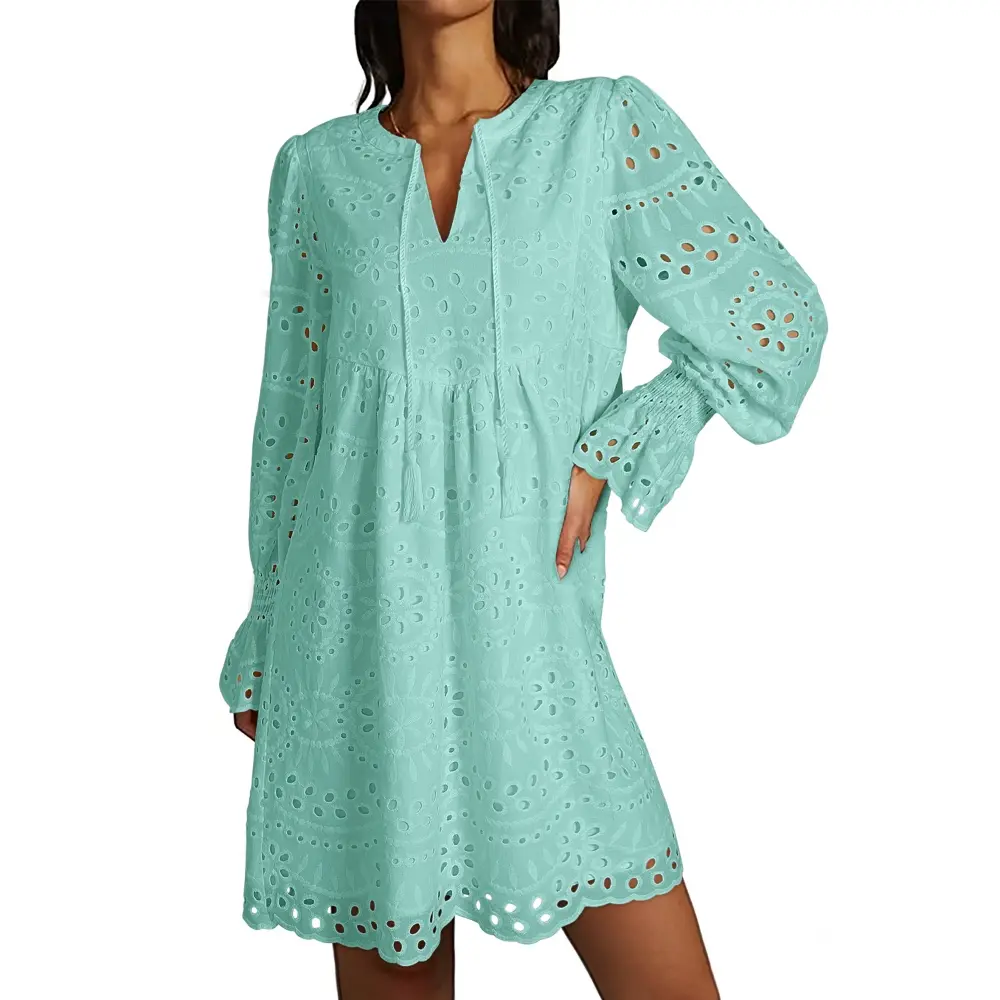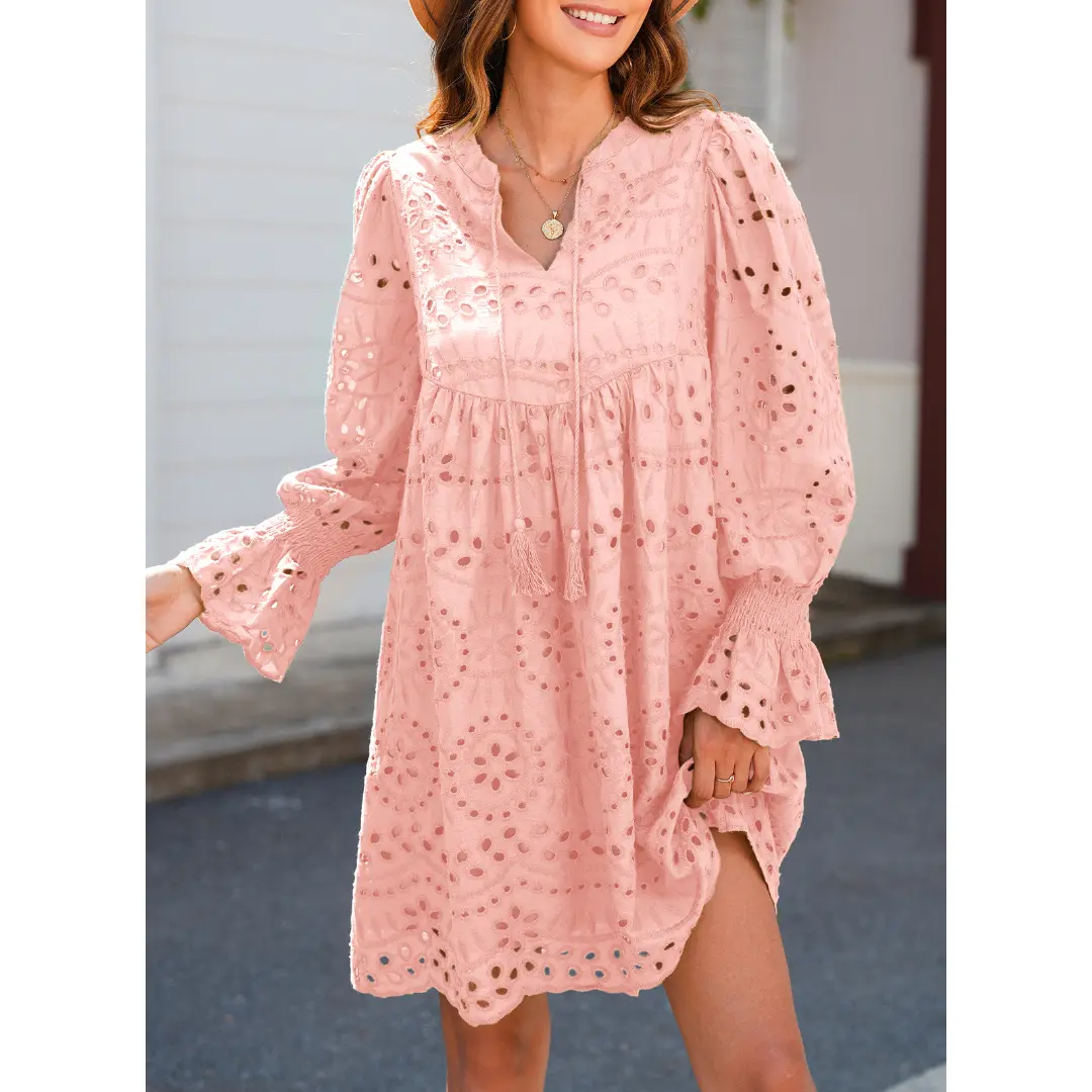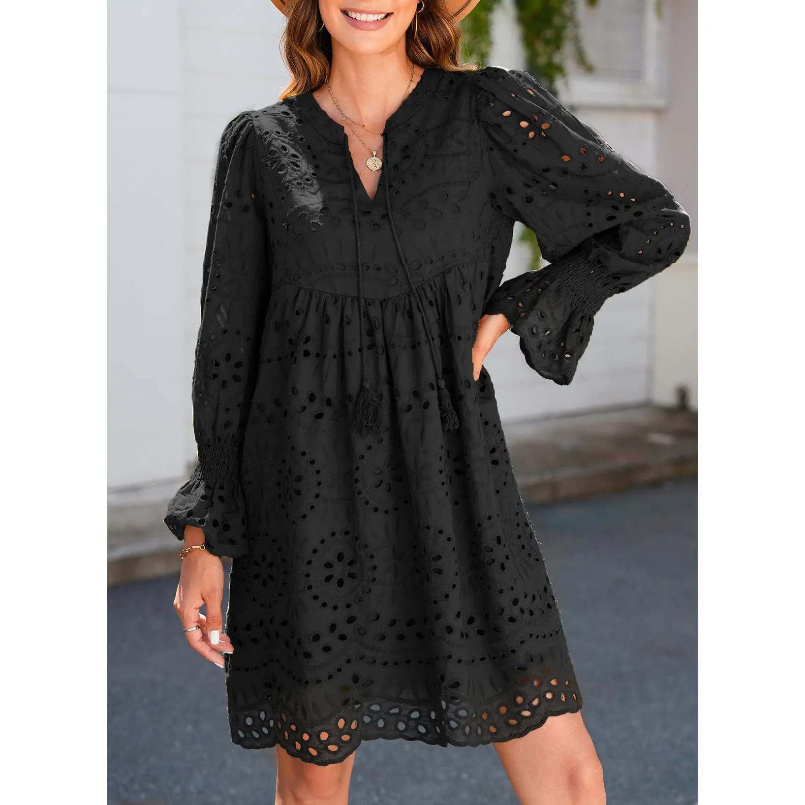 ·Features:Elegant Eyelet Dress For Women 2024 Feature Tassel V Neck Design, Long Sleeve, Hollow Out Eyelet Embroidery Design, Above The Knee Length, Not See Through.