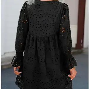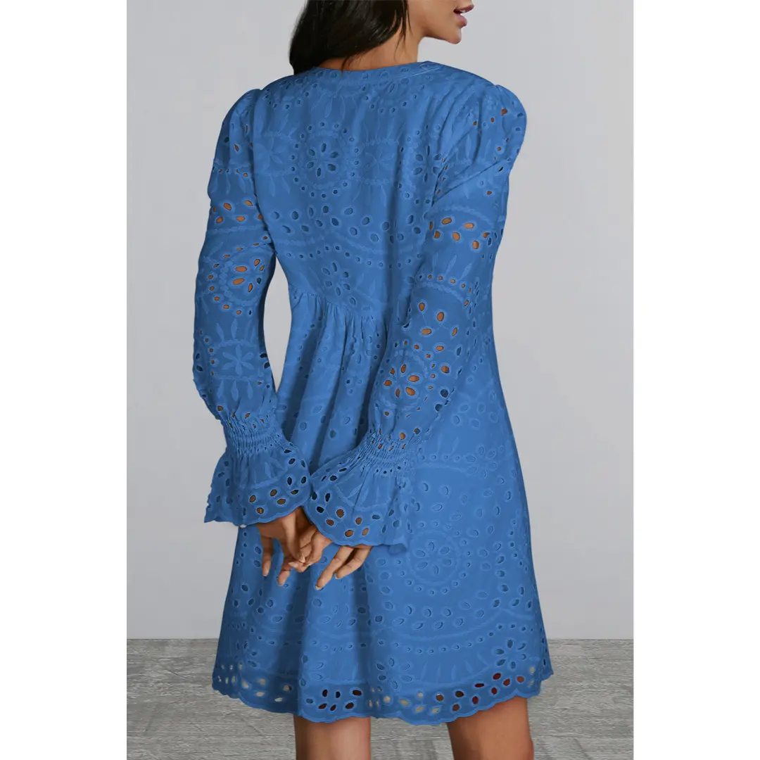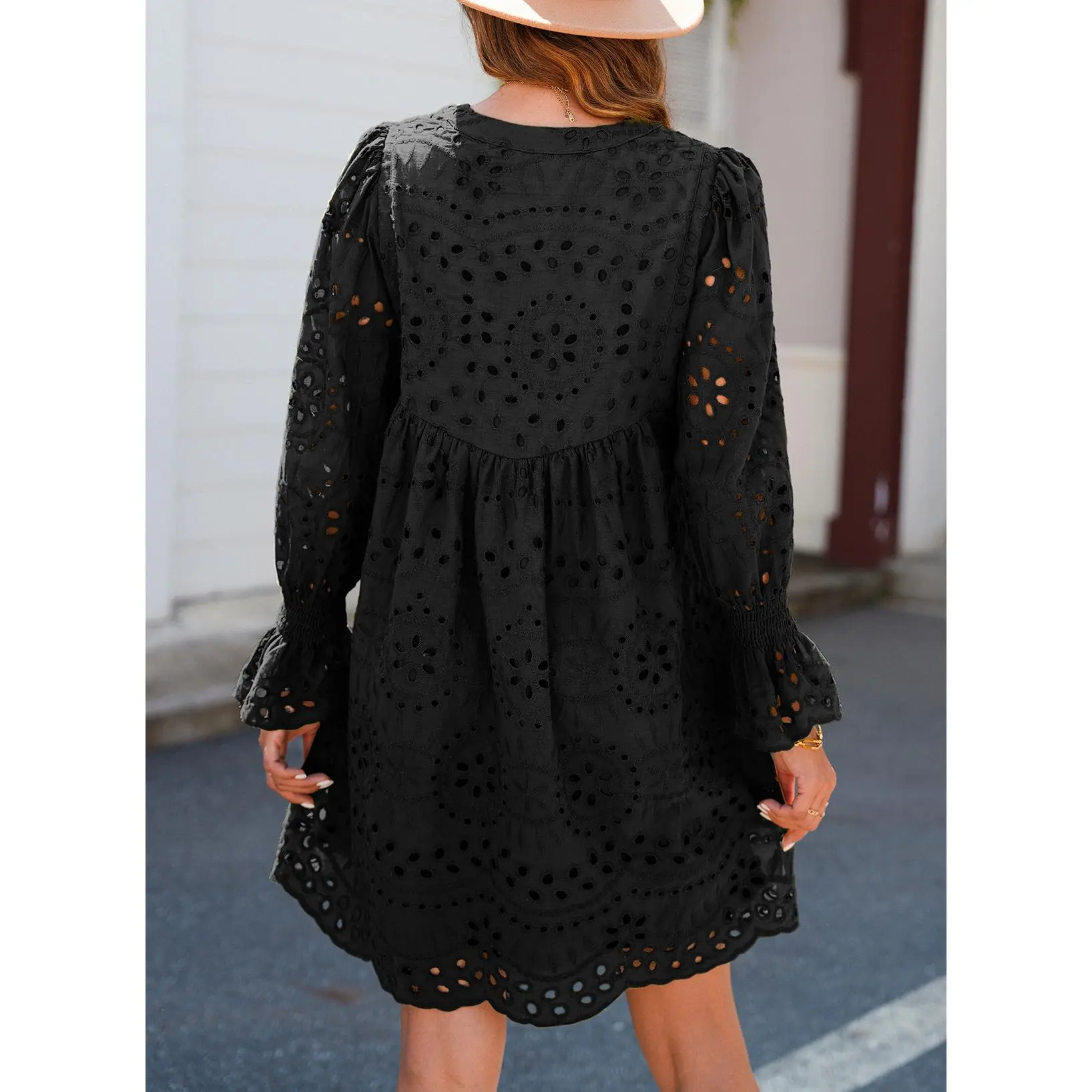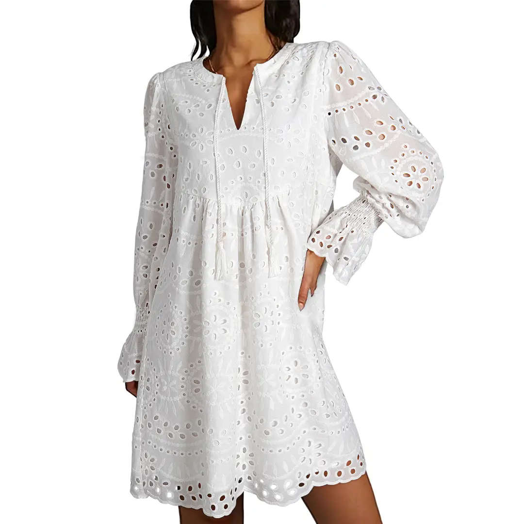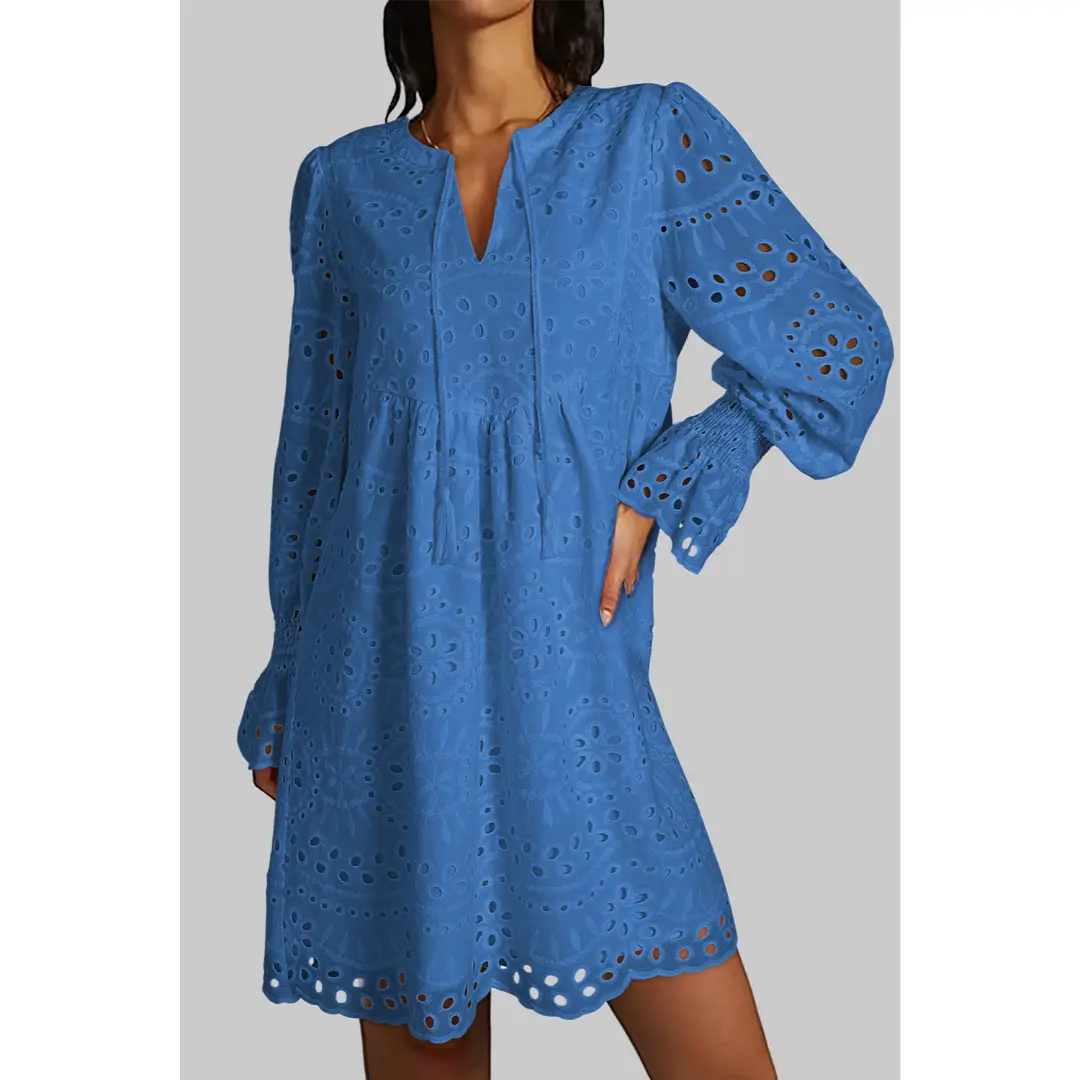 ·Features:Elegant Eyelet Dress For Women 2024 Feature Tassel V Neck Design, Long Sleeve, Hollow Out Eyelet Embroidery Design, Above The Knee Length, Not See Through.