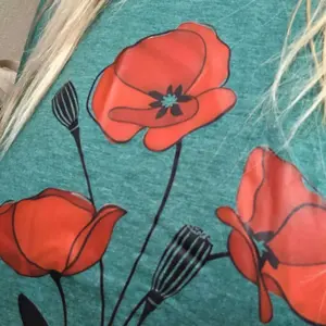 Received this shirt but was disappointed to find that the red flowers are not as visible as shown. They blend into the green making them hard to see, also the shirt runs very large.