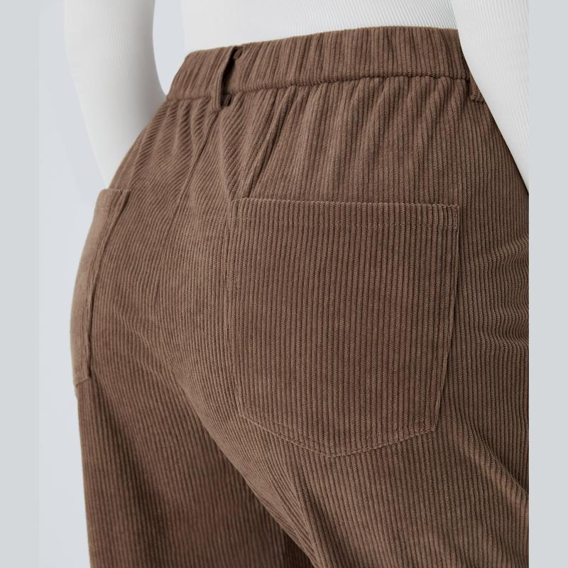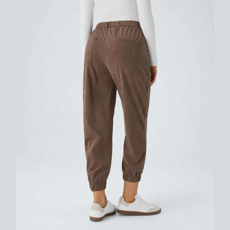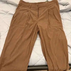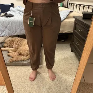 Very cute and comfortable pants. They look and fit like the photo shows. For reference I am 5’3”, 165 lbs, roughly 42/43 hips and roughly 32/33 waist in a size large. They feel sturdy without feeling thick or bulky. Not too light or heavy. Love the stretchy waist band in the back.