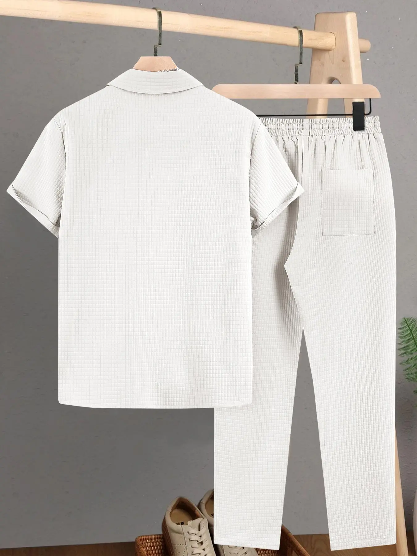 Men's Solid Button Front Shirt & Drawstring Waist Pants Set, Regular Fit Casual Short Sleeve Collared Top & Pocket Trousers, Summer Clothes #menoutfits #flatteringtwopieceset #womenssweatshirtset #sweatpantsset #jeanshortsoutfit #womenstwopieceset #blazerandpantsset #menswardrobeessentials #menssummeroutfit #menssummerfits