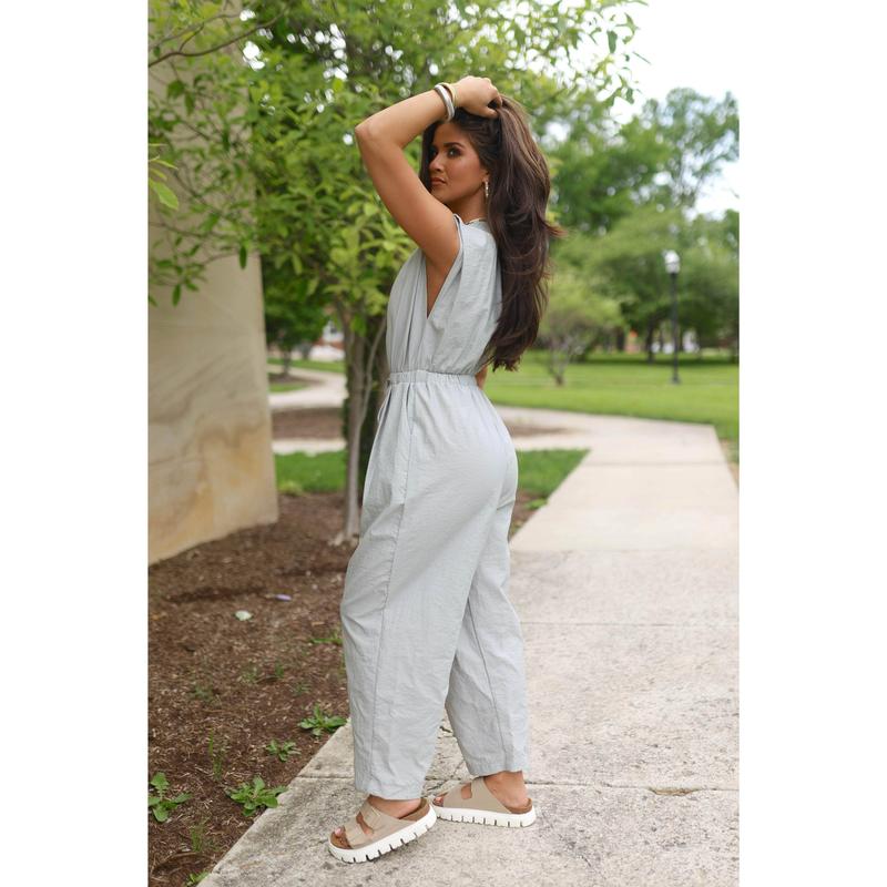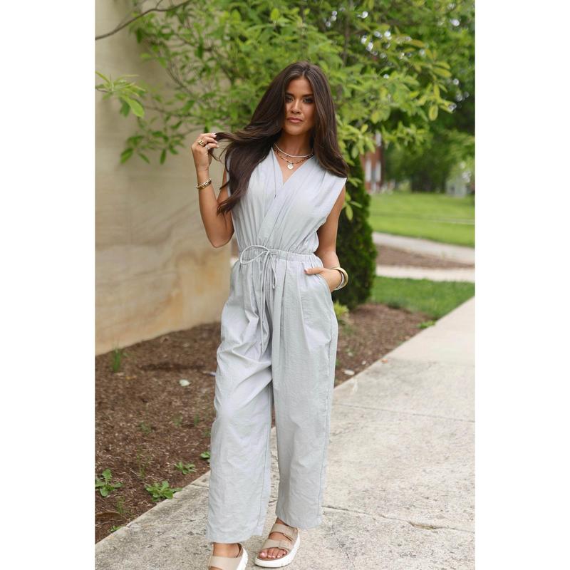 Introducing our Casual Mode Jumpsuit. Made with thin lightweight fabric, this sleeveless jumpsuit features a V neckline and elastic waist band with an adjustable tie for a perfect fit. Pleat details on the shoulders add a touch of elegance. Effortlessly stylish for casual days.