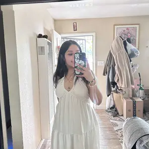 the dress IS SUPER CUUTTEE i got a large and you can tie it to be tighter if you need i just like how it’s loose and i could of got a medium since its a very loose dress but im glad i got a large and the white one which is the one i got is a bit see-through so I would recommend wearing nipple covers