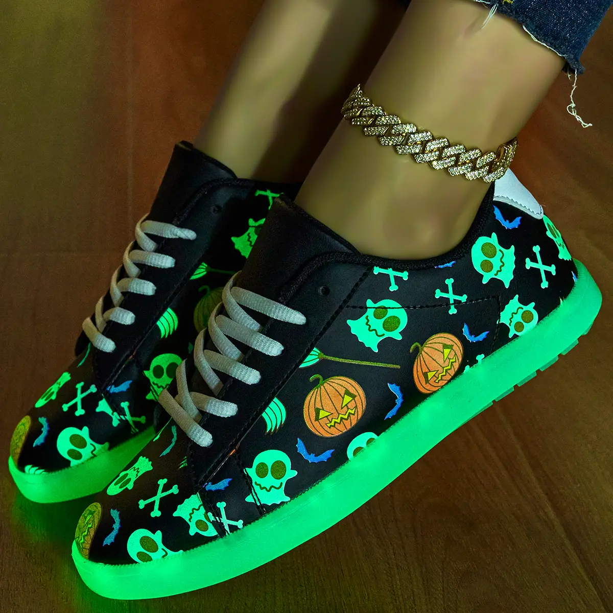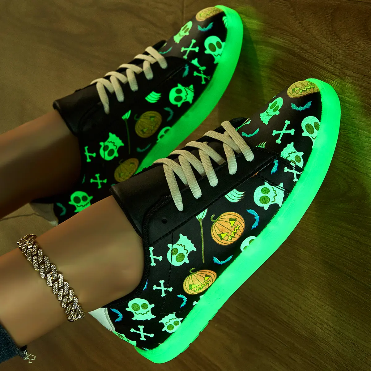 Unisex Casual Fashion Sneakers with Light Up Feature - Halloween Skull and Pumpkin Pattern, Non-Slip Rubber Sole, Low Top Lace-up with Round Toe - All-Season Fluorescent Board Shoes Closed Trainer Walking Shoes Sports Shoes Runner Boy