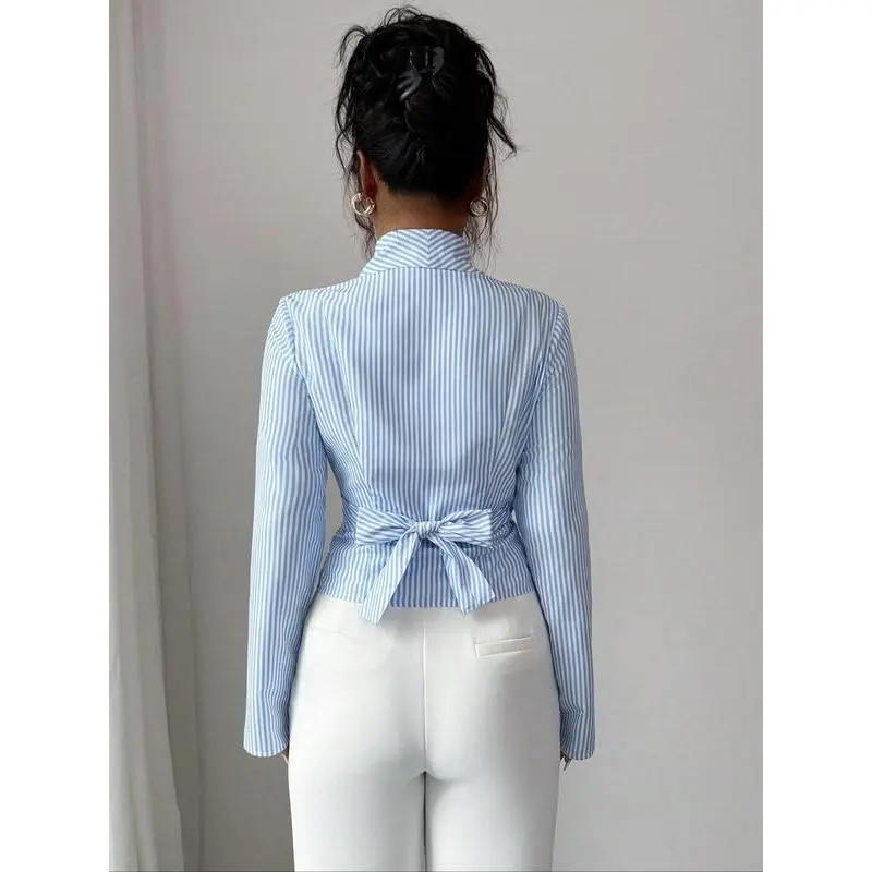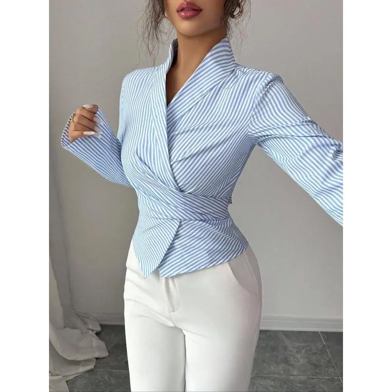 Casual Striped Wrap Shirt Dress, Slim-Fitting Office Wear, Women's Fashionable Long Sleeve Top, Comfortable Commuter Style