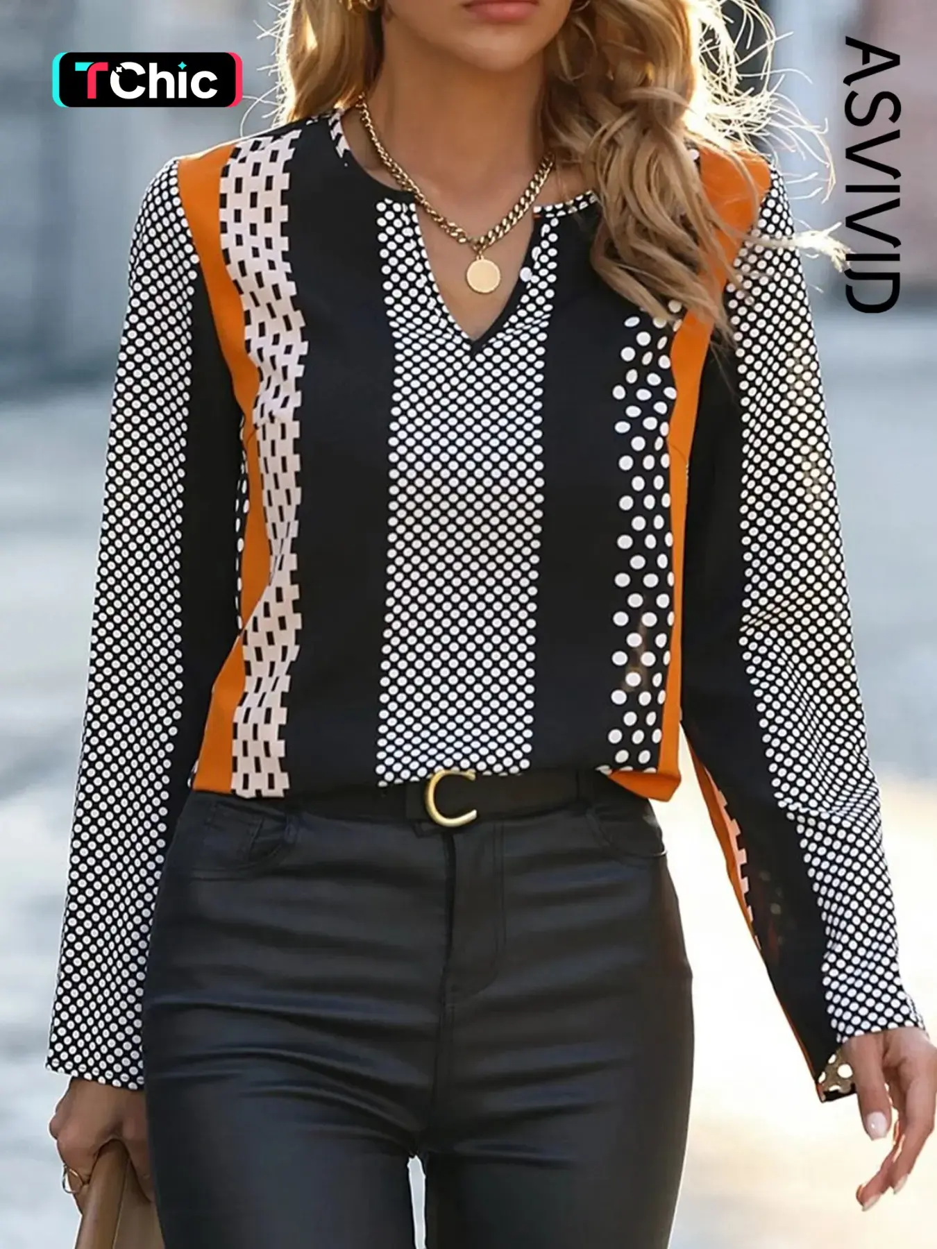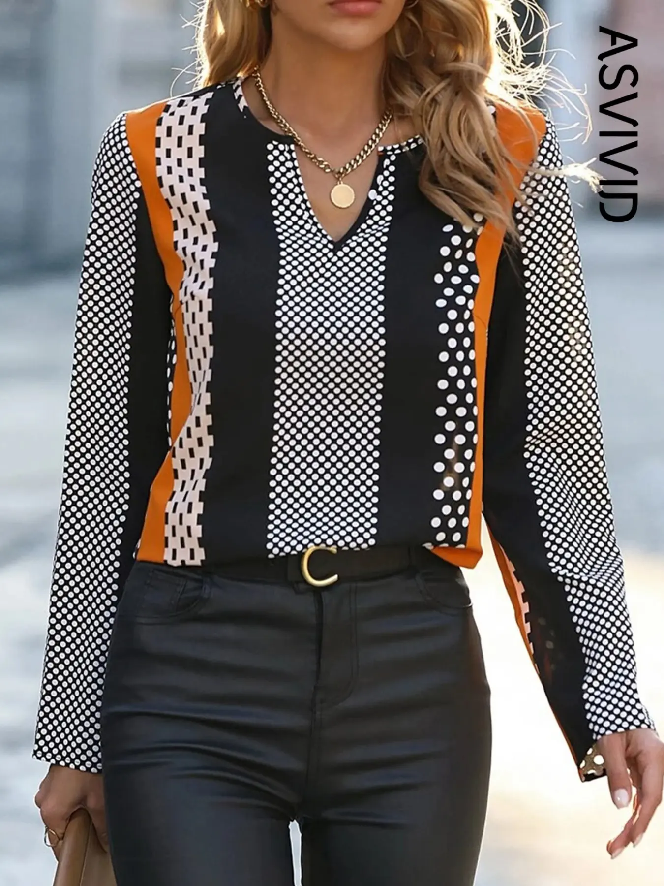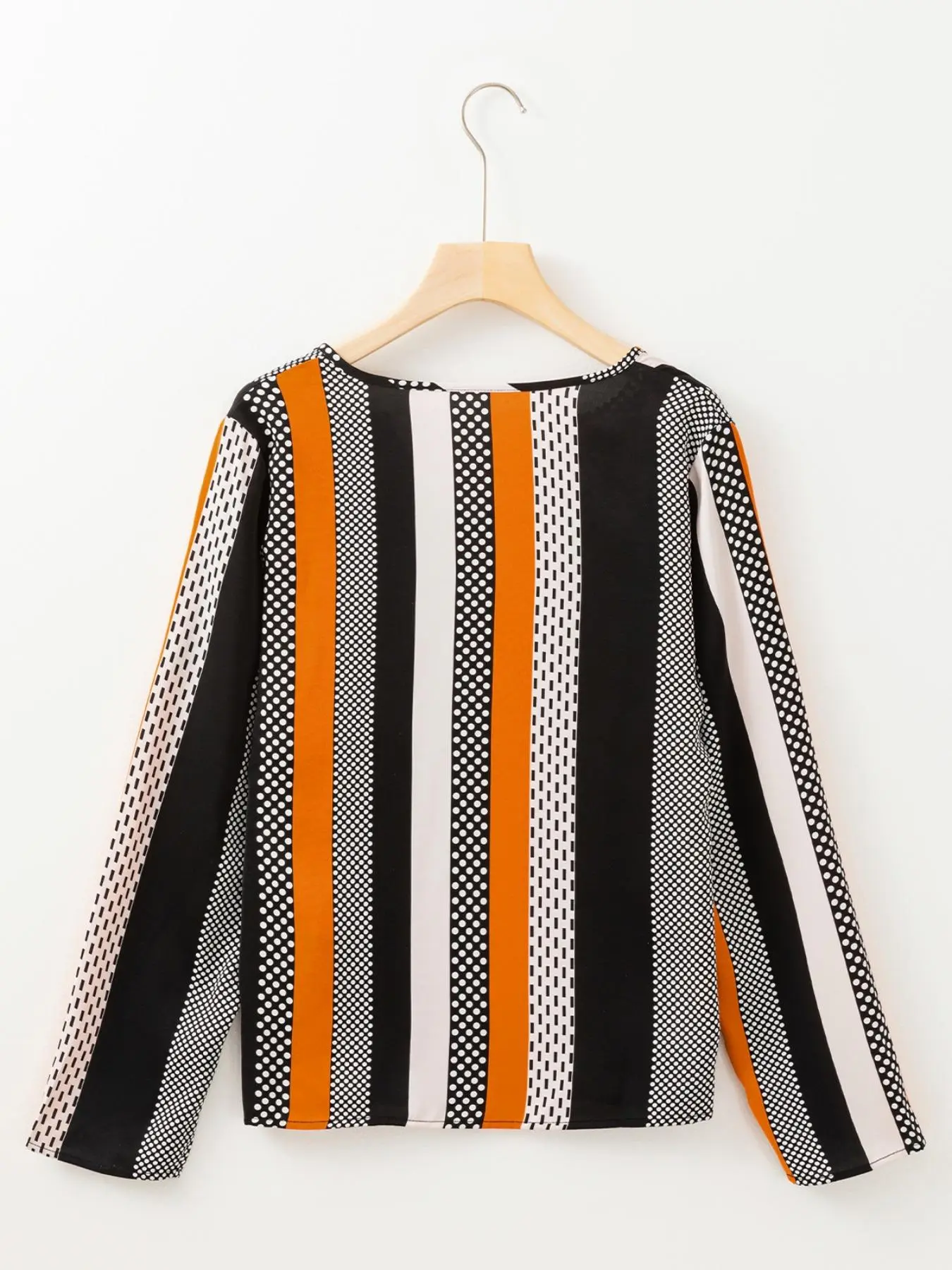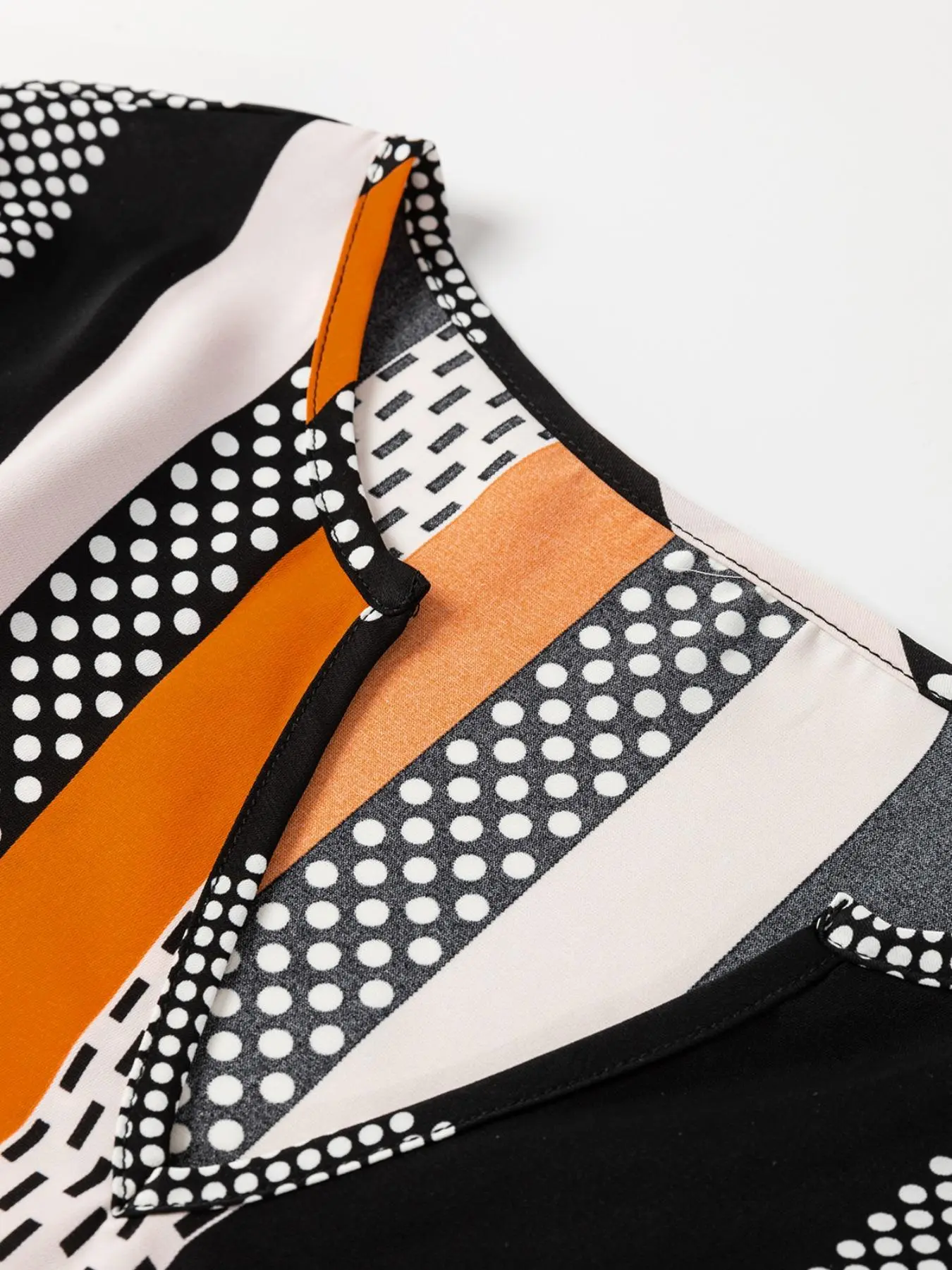 ·The blouse is adorned with a trendy geometric print that adds a bold and graphic touch.