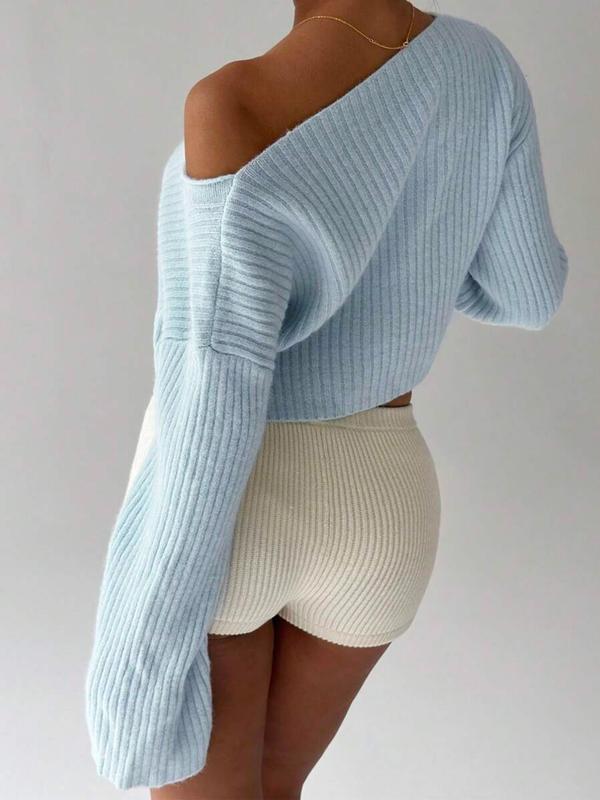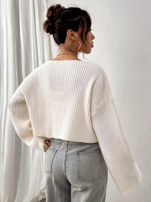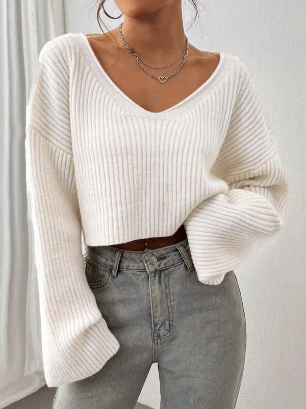 5. Casual Solid Color V Neck Drop Shoulder Crop Ribbed Knit Sweater