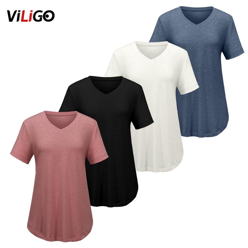 VILIGO Short Sleeve Shirts for Women Casual V-Neck Plain Tees - Set of 4, Various Color Combinations, Curved Hem Comfort Womenswear