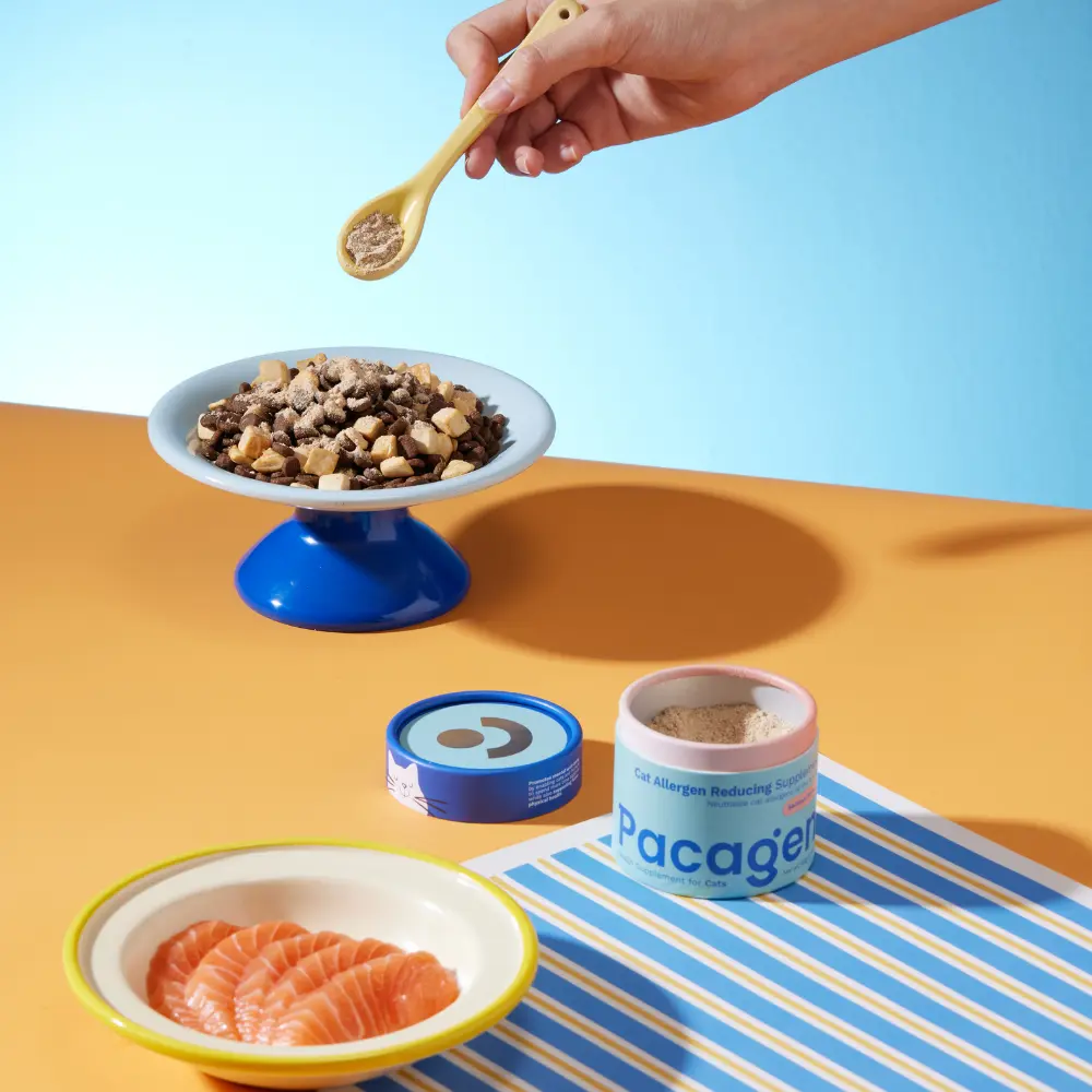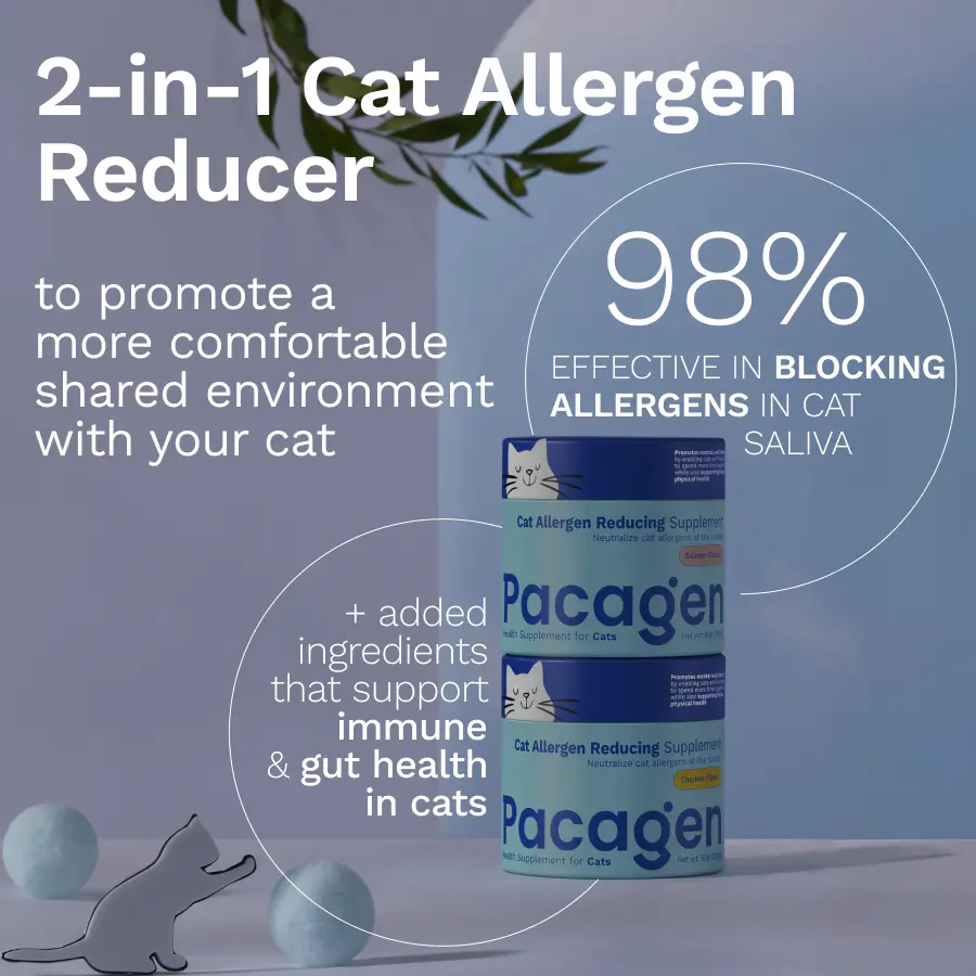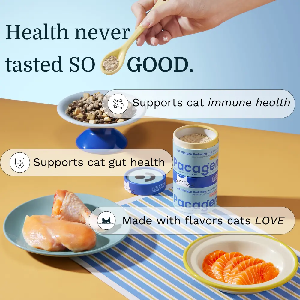 I started using Pacagen cat food topper with my cat because I have really bad allergies to cats. I also started allergy immunotherapy, so I'm not sure how much of the benefits can be attributed to what, but my symptoms have dramatically improved one way or the other. The only downside is it's tough to use this with an automatic feeder because it means not only do I have to add the topper manually, but I also have to add it before my cat eats all of its food.