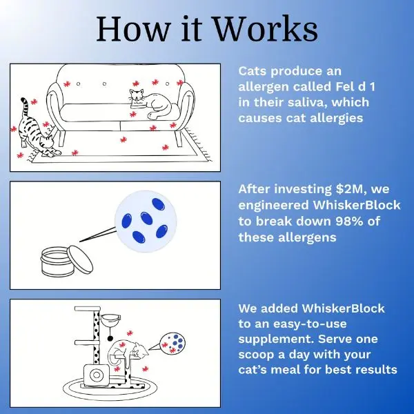 I had pretty bad allergies when i first got my baby. After doing some research, I found this powder. What I love about it is that you can use it on the food they love & I really believe it works. Using this product, along with doing other things to reduce my cat allergy, I am not breathing free & clear without meds.
