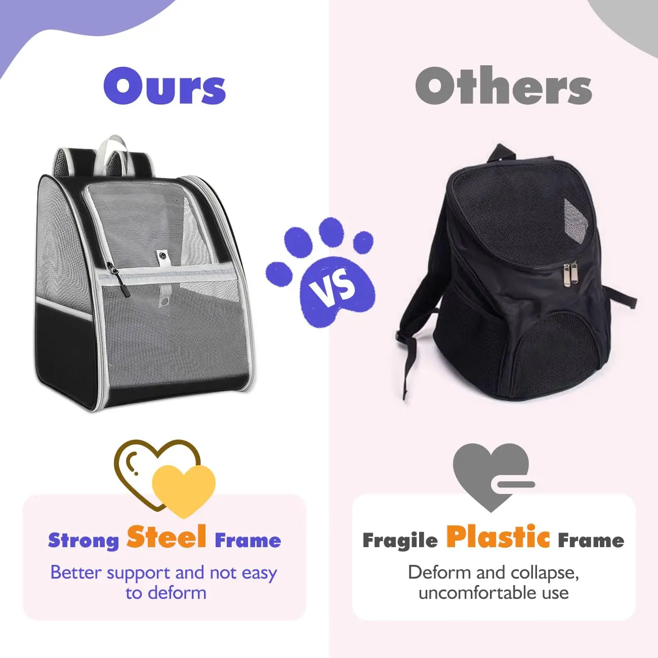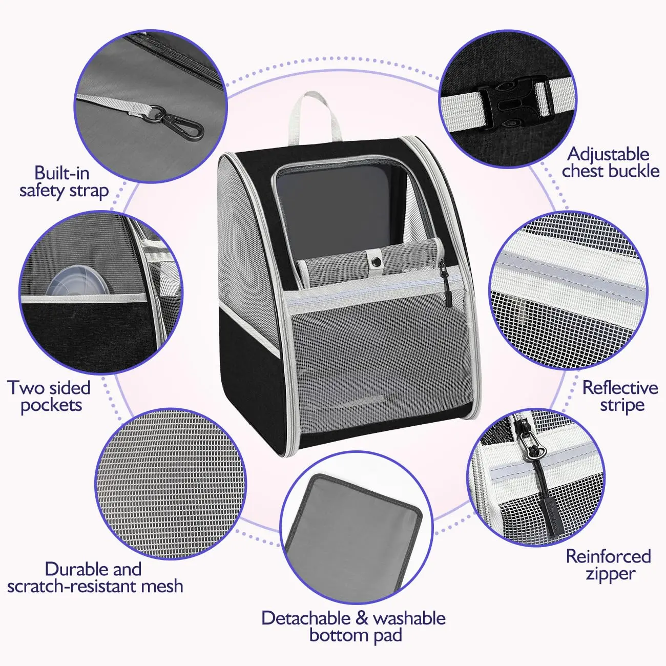Equipped with an adjustable safety strap to prevent pets from jumping out. Soft cushions ensure your pet feels comfortable. The backpack is durable, made of sturdy polyester fiber and PVC mesh, resistant to scratches and bites.