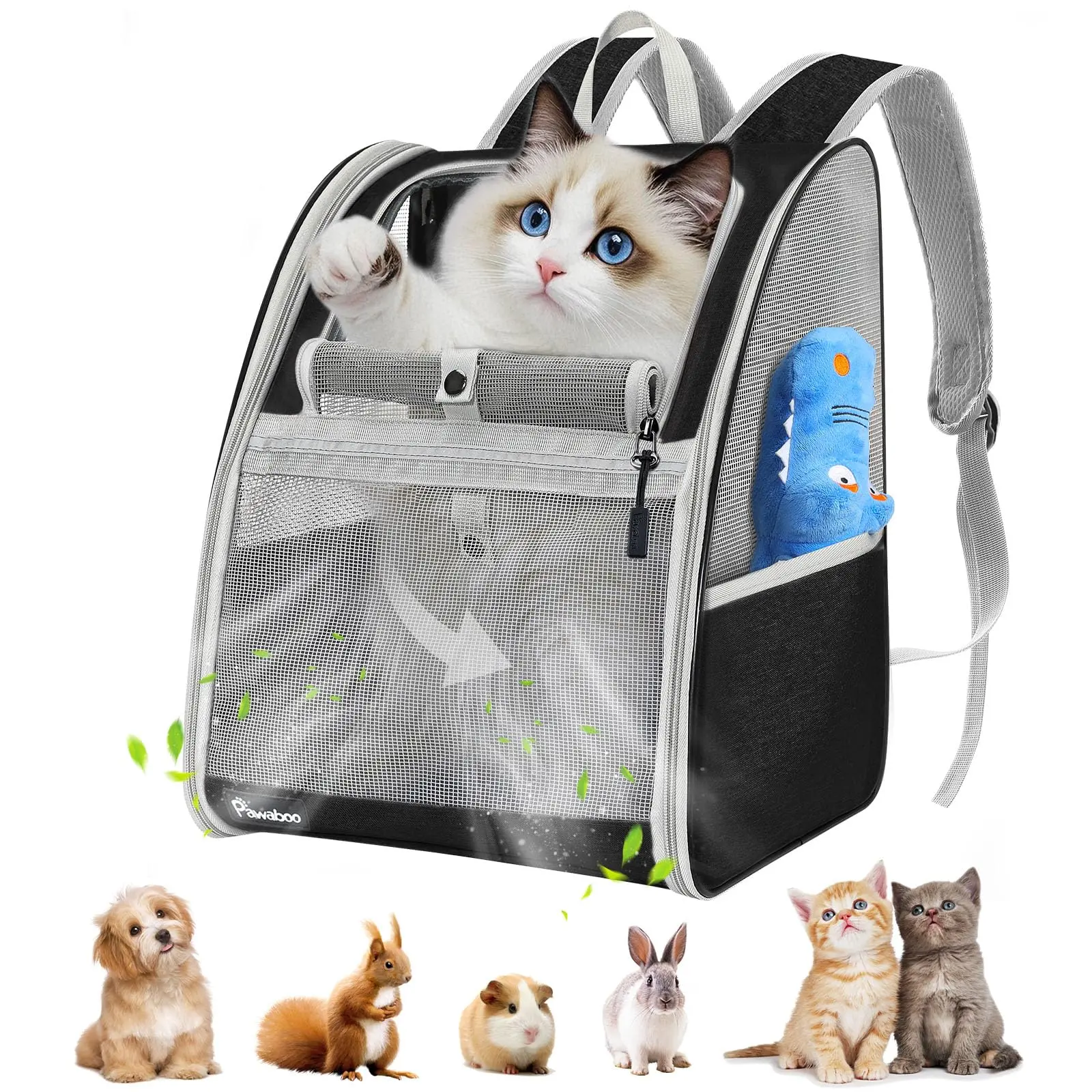 The Pawaboo Cat Carrier Backpack measures 12.6" L x 11.4" W x 16.5" H, perfect for cats, small dogs, or small animals up to 22lbs. Ideal for travel, hiking, walking, or cycling. Enjoy a wonderful trip with your furry friend. This backpack ensures your pet's safety and comfort during any outdoor activity.